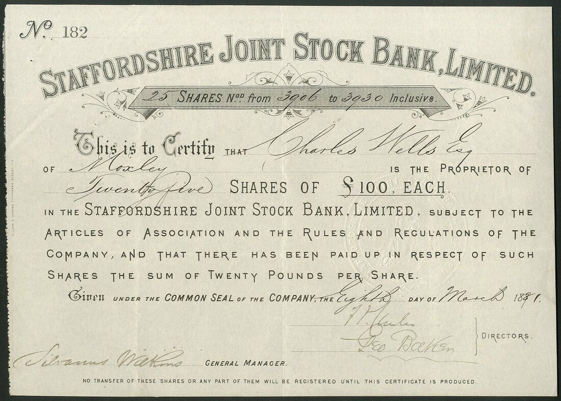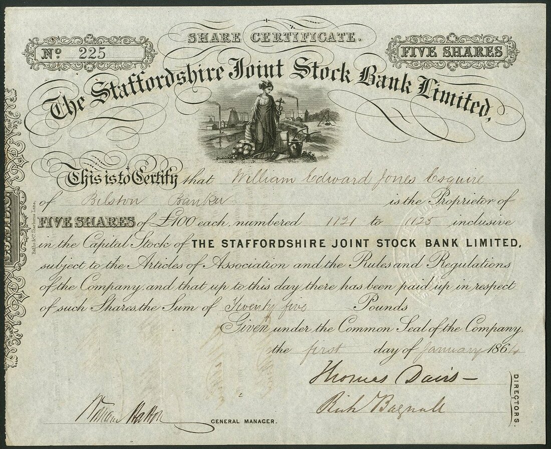 Great Britain: Staffordshire Joint Stock Bank Ltd., certificate for 5 shares, 186[4], #225, vignette at top, black, together with £100 shares, 188[91], #182, black. Formed in 1864. Amalgamated with the Birmingham Banking Company Limited in 1889. GVF and EF respectively (2).