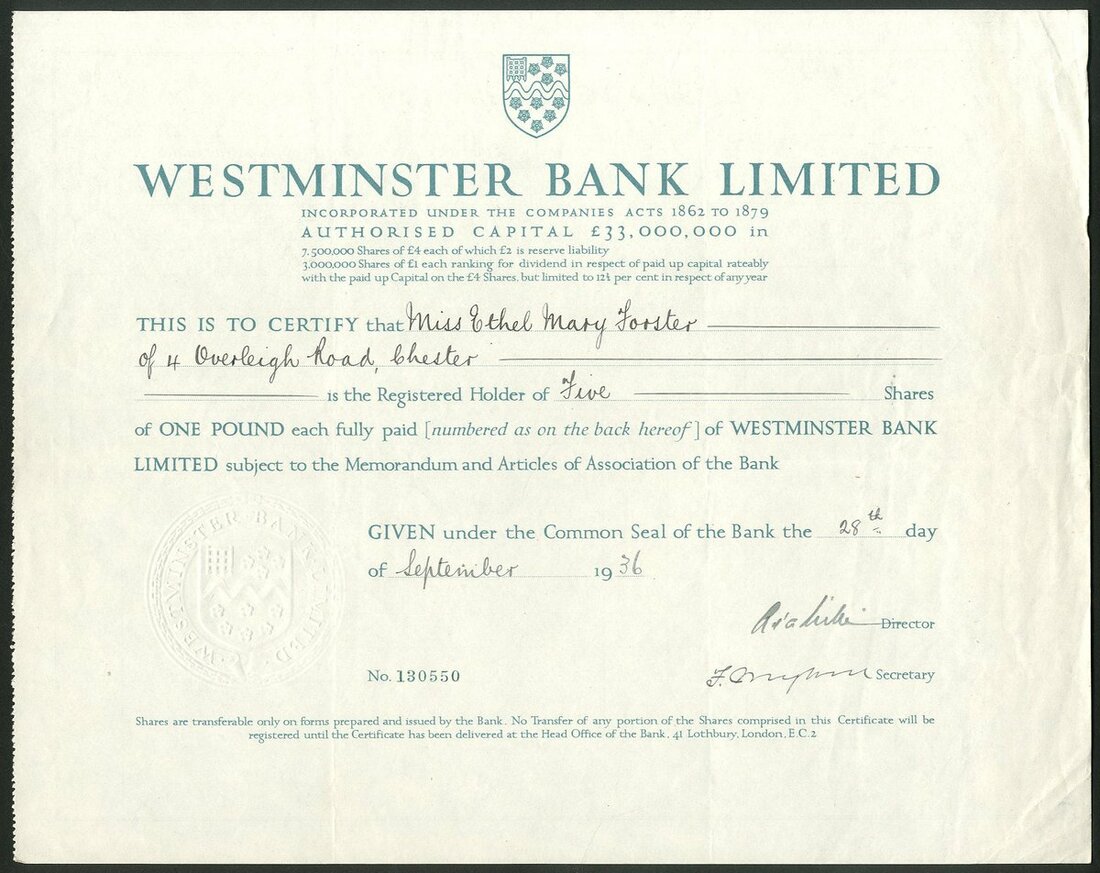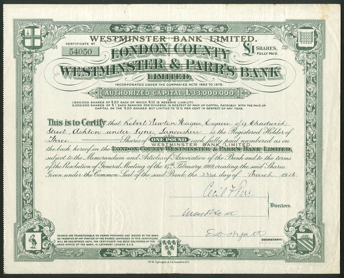 Great Britain: Westminster Bank Ltd., overprinted on London County Westminster & Parr's Bank Ltd., £1 shares, 19[26], #54050, signed by Cecil Parr, scrollwork border, green, together with a second certificate for £1 shares, 19[36], blue. Both VF. (2)
