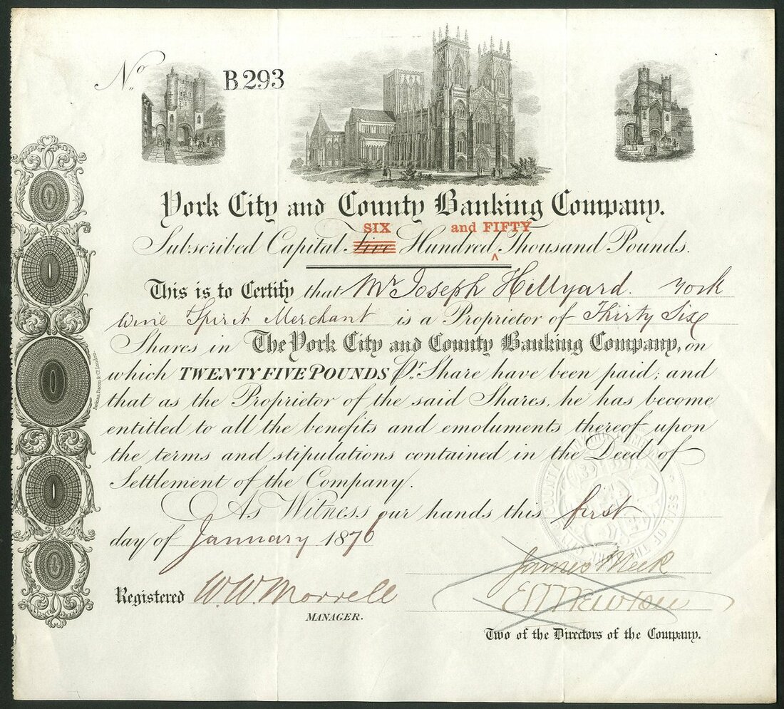 Great Britain: York City and County Banking Co., certificate for shares, £25 paid, capital £650,000 overprinted on £500,000, 18[76], #B293, vignettes at top of York Minster and city walls, scrollwork at left, black. VF.