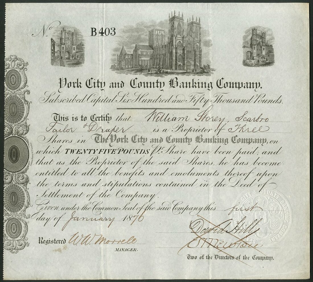 Great Britain: York City and County Banking Co., certificate for shares, £25 paid, capital £650,000, 18[76], #B403, vignettes at top of York Minster and city walls, scrollwork at left, black. VF.