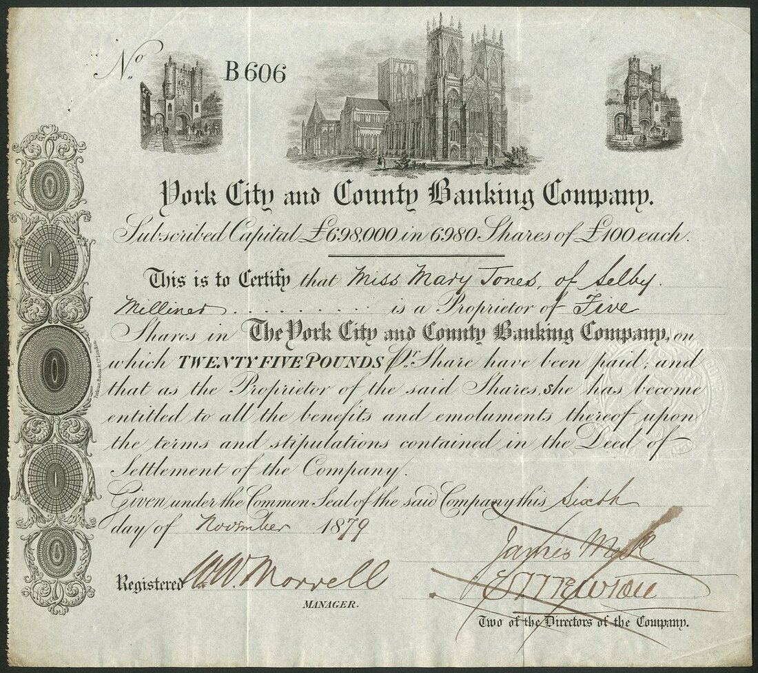 Great Britain: York City and County Banking Co., certificate for £100 shares, £25 paid, capital £698,000, 18[79], #B606, vignettes at top of York Minster and city walls, scrollwork at left, black. VF.
