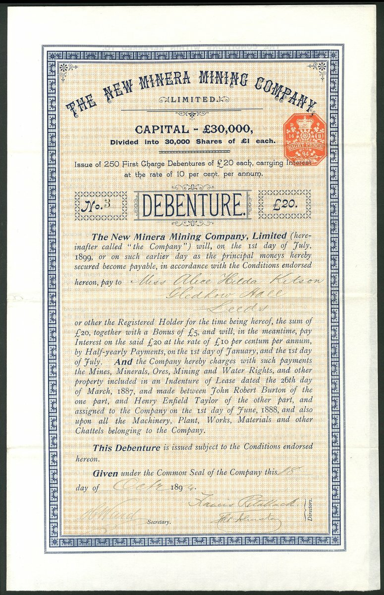 Great Britain: New Minera Mining Co. Ltd., £20 debenture, 189[4], #3, large 4 page format with decorative border, blue with buff underprint. Mines at Wrexham, North Wales. GVF.