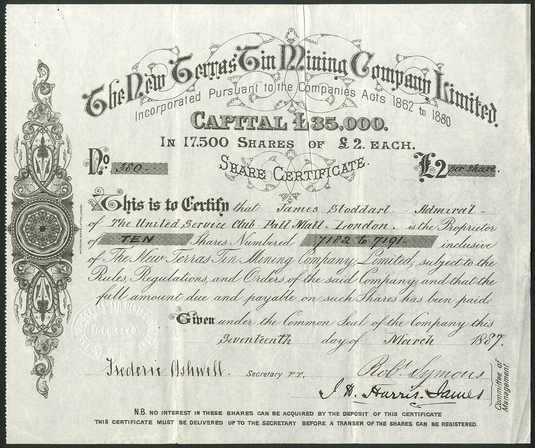 Great Britain: New Terras Tin Mining Co. Ltd., £2 shares, 18[87], #380, decorative black printing. Tin mines at St. Stephen, Cornwall. Pin holes top left, GVF.