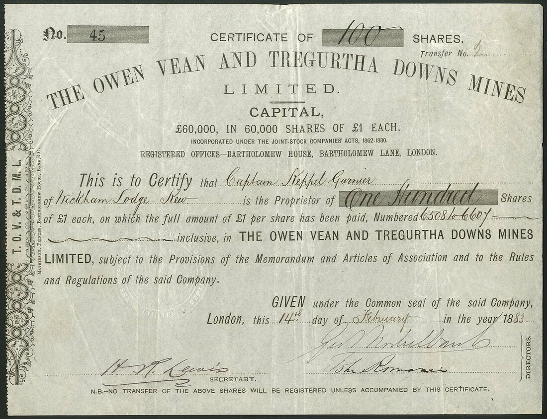 Great Britain: Owen Vean and Tregurtha Downs Mines Ltd., £1 shares, 18[83], #45, black. Copper and Tin mining. Creasing, VF.