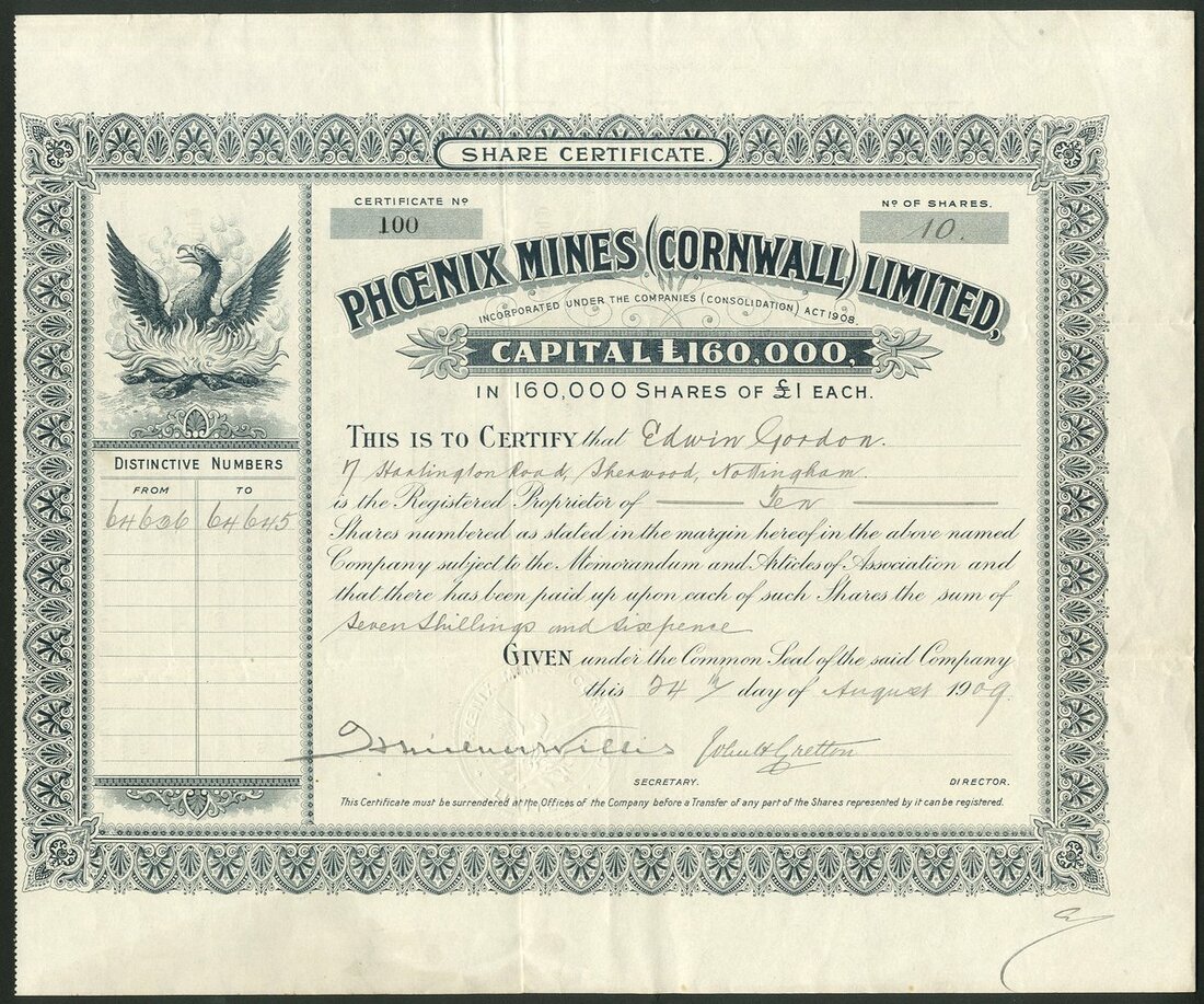 Great Britain: Phoenix Mines (Cornwall) Ltd., £1 shares, 19[09], #100, ornate border with phoenix top left, blue/black. VF.