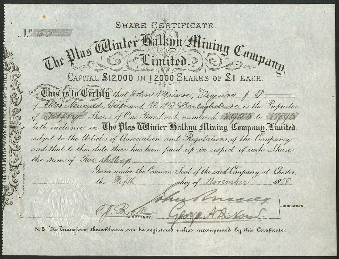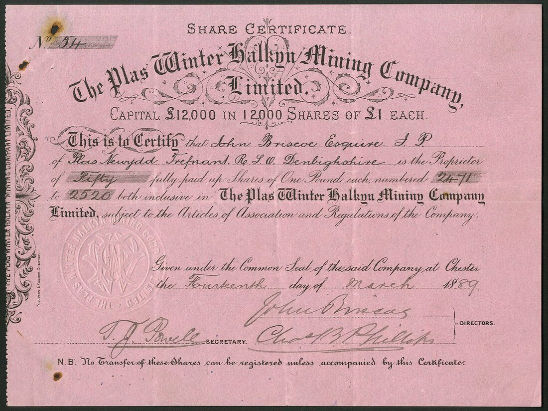 Great Britain: Plas Winter Halkyn Mining Company Limited, pair of certificates for £1 shares, part paid, 18[88], black, #66 and fully paid, 18[89], #54, black on pink paper. Lead mines in Flintshire. The second with rusty pin holes otherwise both VF and scarce (2).