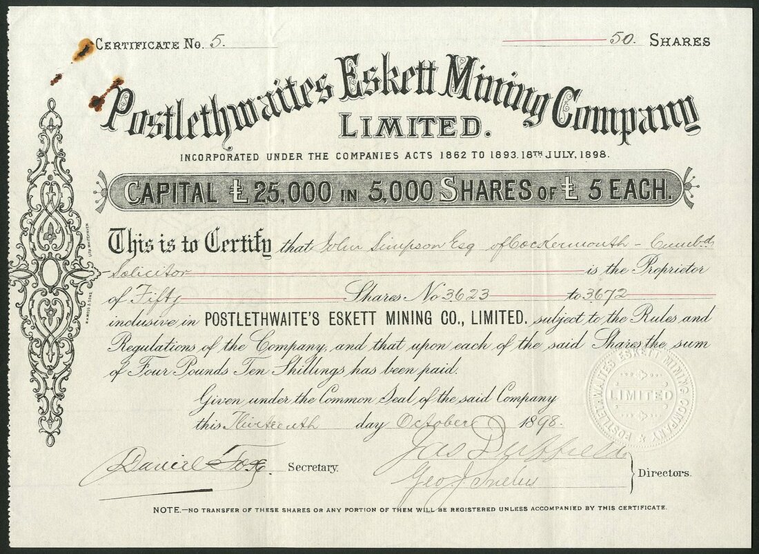 Great Britain: Postlethwaites Eskett Mining Co. Ltd., £5 shares, 18[98], #5, black. Rusty staple holes top left, GVF and rare..