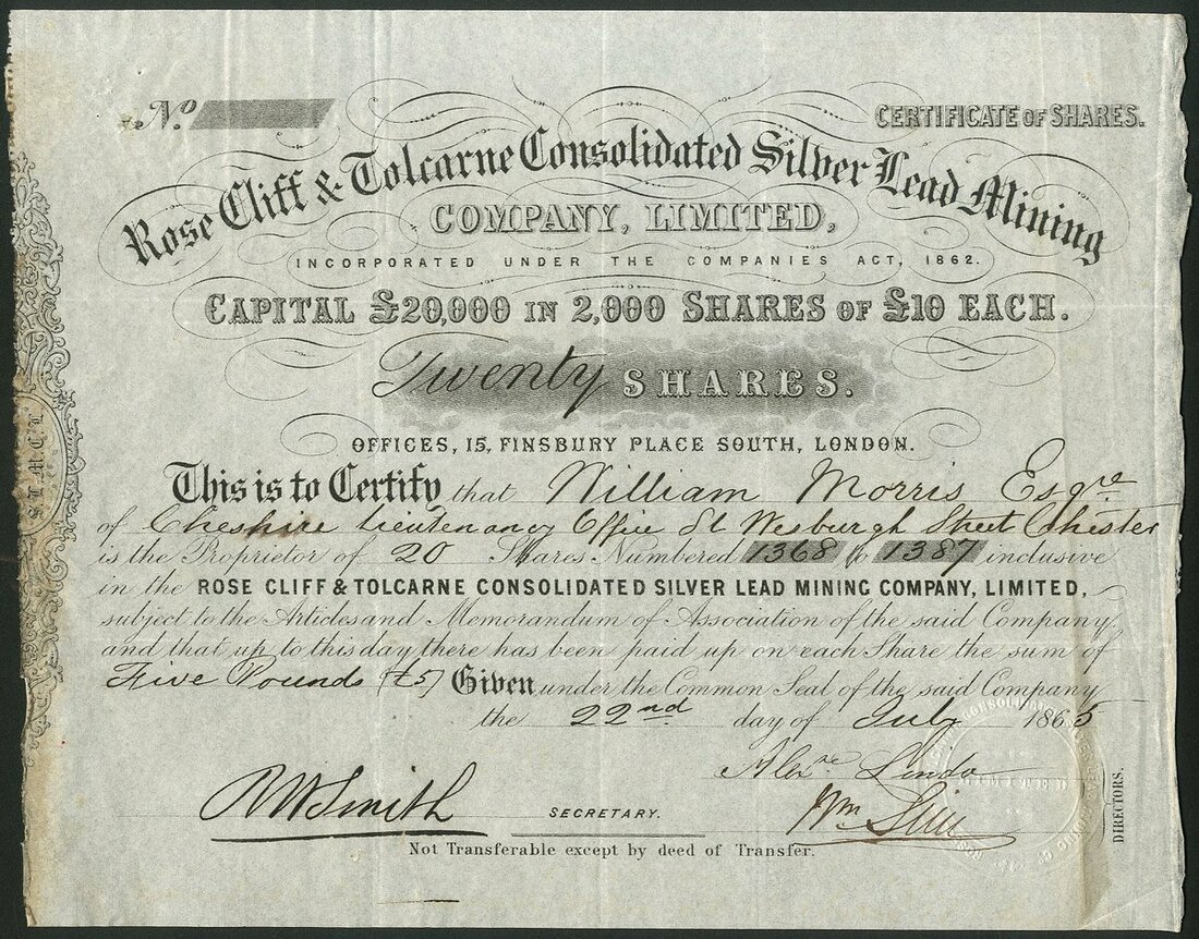 Great Britain: Rose Cliff & Tolcarne Consolidated Silver Lead Mining Co. Ltd., £10 shares, 186[5], scrollwork at left, black. Mines at Tolcarne, St.Columb, Cornwall. Glue residue at left edge, VF and scarce.