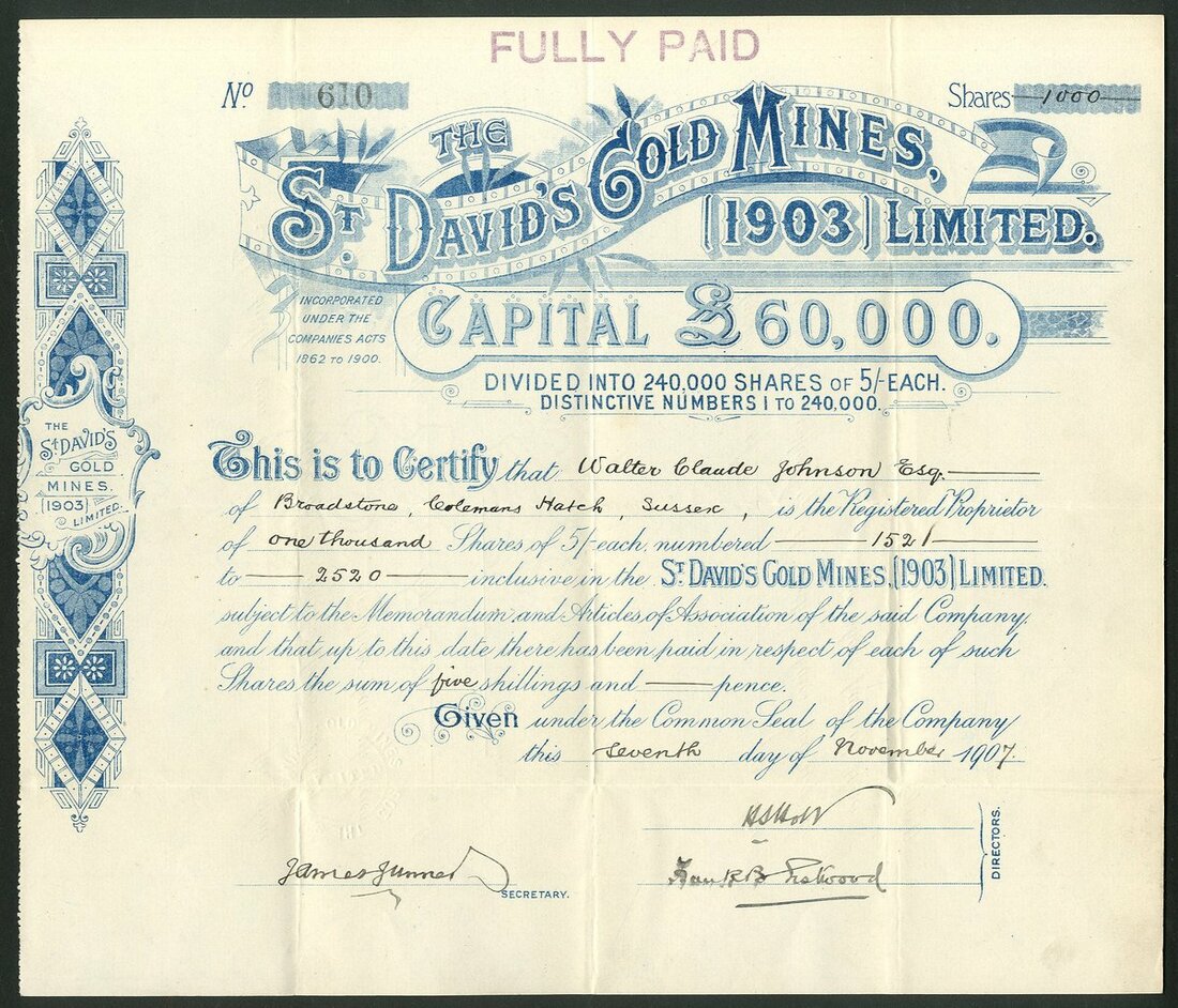 Great Britain: St.David's Gold Mines (1903) Limited, 5/- shares, 190[7], #610, scrollwork at left, blue. Famous gold mines at Bontddu, a few miles from the coastal town of Barmouth. A rare piece of which only one has been seen previously, sold by us in 2009. GVF.