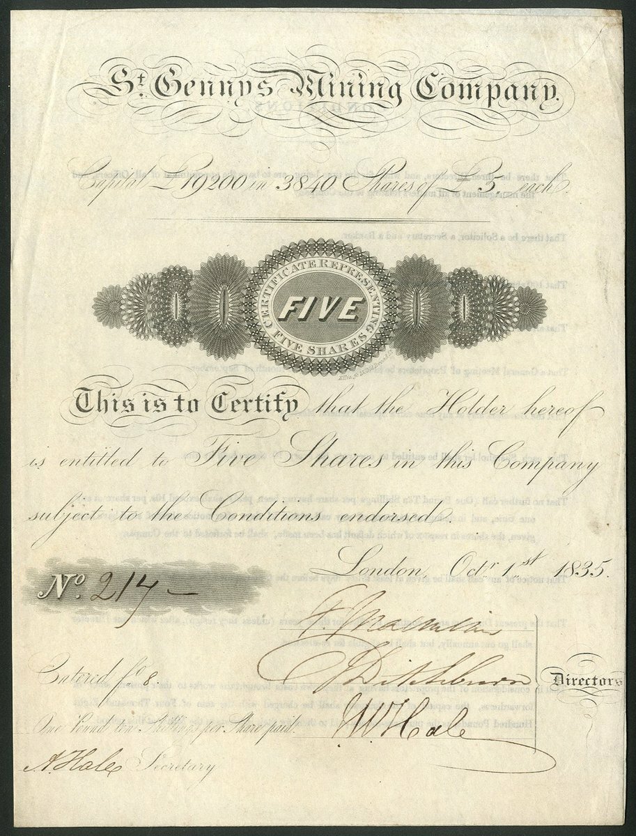 Great Britain: St.Gennys Mining Company, 5 shares of £5, 1835, #217, scrollwork in centre, black printing, on vellum, 4 pages with conditions printed on the inside. Mines at St. Gennys parish 7 miles from Bude, Cornwall. GVF.