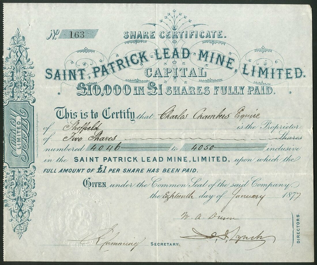 Great Britain: Saint Patrick Lead Mine Limited, £1 shares, 187[7], #163, scrollwork at left, blue. Formed in 1874 to acquire the mineral lands at Top-y-Fron, Halkin, Flintshire, North Wales. One of only 4 pieces found in 2016. VF.