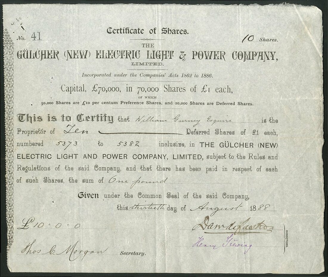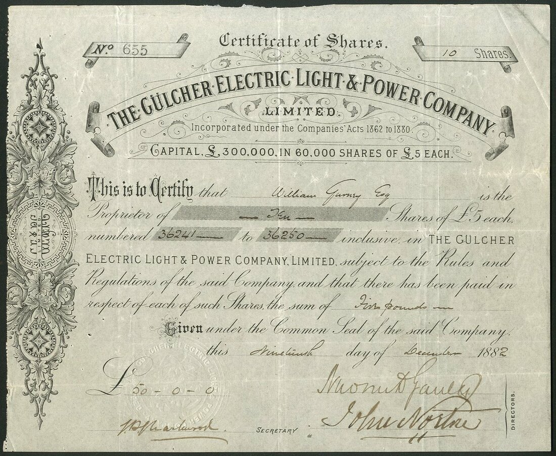 Great Britain: Gulcher Electric Light & Power Co. Ltd., £5 shares, 188[2], #655 together with Gulcher (New) Electric Light & Power Company Ltd., £1 shares, 18[88], #41, black. The Gulcher patents for electric lights were exhibited at the Paris Exposition and this company acquired the rights for the United Kingdom, reorganised after a few years with NEW added to the title, the latter being wound up in 1896. VF (2).