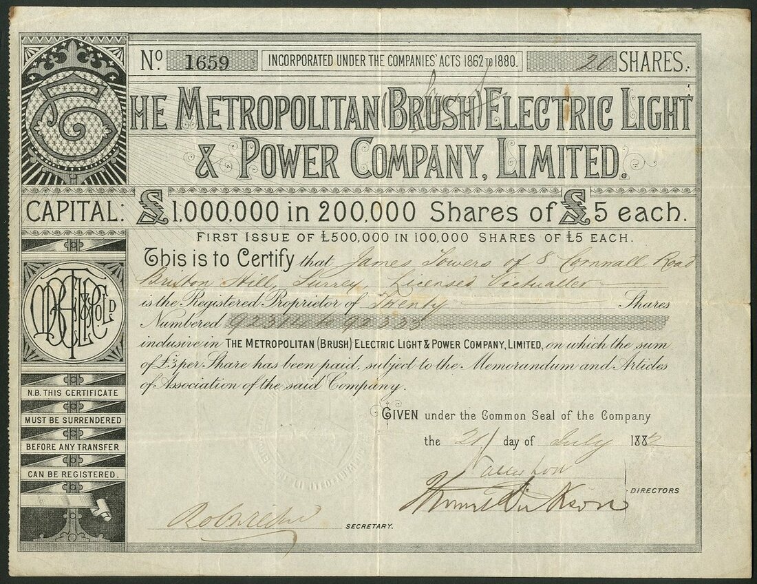 Great Britain: Metropolitan (Brush) Electric Light & Power Co. Ltd., £5 shares, £3 paid, 188[2], #1659, attractive printing, black. Formed in 1882 to acquire licenses to operate the American Brush system in the Greater London area. One of the earliest electric lighting companies in the country. VF and rare.