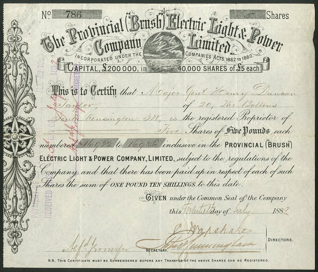 Great Britain: Provincial ("Brush") Electric Light & Power Co. Ltd., £5 shares, 188[2], #786, small vignette of lightning at top, scrollwork left, black. Registered in 1882 to operate licenses from the Anglo American Brush Electric Light Corporation for the counties of Hertford, Bedford, Cambridge, Buckingham, Huntngdon, Suffolk, Norfolk and Rutland. In liquidation by 1886 but shareholders paid in full despite the liceses turning out to be of little value. VF and scarce.