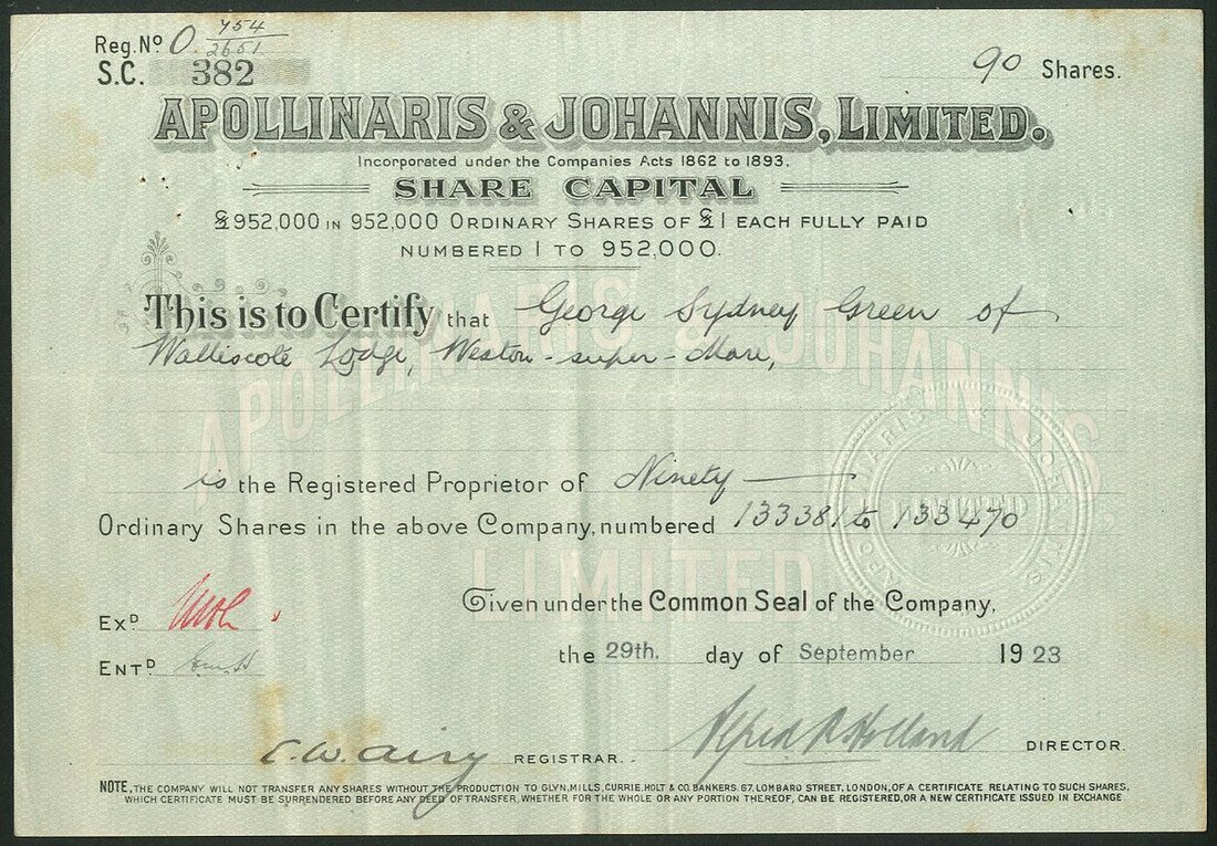 Great Britain: Apollinaris & Johannis Ltd., £1 shares, 19[23], #382, black on green underprint. Spring water products from the Apollinaris Spring in the Rhine Provinces, Germany, founded in 1850's. By 1913 the company was producing 40 million bottles! Later branched into aerated and sweetened drinks under the 'Presta' name. Acquired by Cadbury-Schweppes and more recently by Coca Cola Very slight discolouration, GVF and rare..