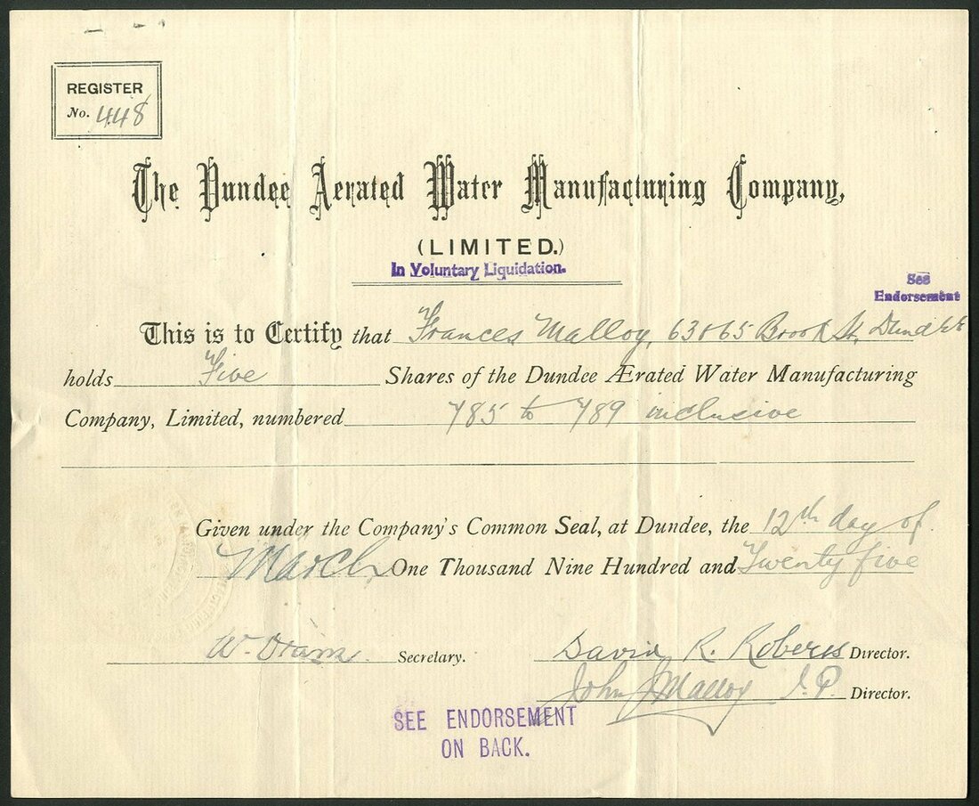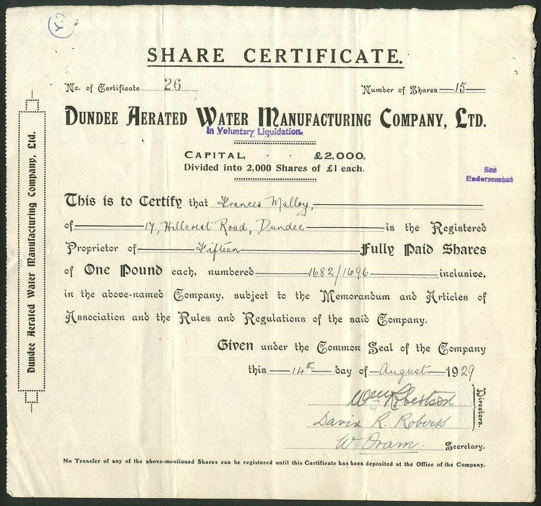 Great Britain: Dundee Aerated Water Manufacturing Co. Ltd., pair of share certificates, dated 19[25], #448, and 19[29], #26, the first with no par value, the latter £1 shares, both black, stamped with 'In Voluntary Liquidation' below title. The company was incorporated in 1874 and took over the soda works of in Magdalen Yard Road. Works rebuilt in 1930 and expanded into alcoholic drinks shortly after. The company continued until 1961 going into voluntary liquidation. Both VF and rare. (2)