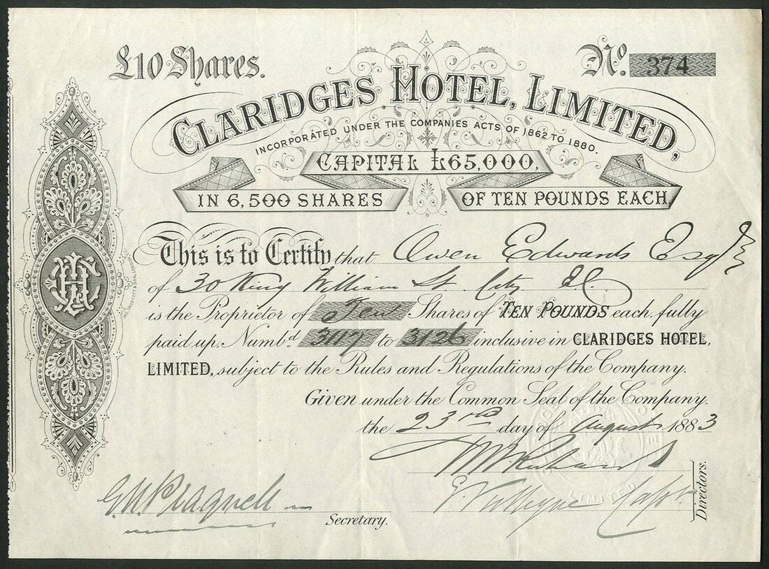 Great Britain: Claridges Hotel Ltd., £10 shares, 188[3], #374, decorative black printing. Founded by William and Marianne Claridge who began running a hotel in a single house at 51 Brook Street. In 1854 they purchased the adjoining five buildings and opened Claridge’s in 1856. In subsequent years the hotel was visited by Queen Victoria and Prince Albert, and quickly became popular with Royalty and celebrities worldwide. VF.
