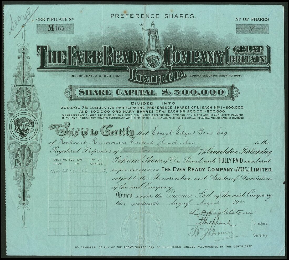 Great Britain: Ever Ready Company (Great Britain) Limited, 7% Cumulative Participating Preference shares, 19[20], #M465, Britannia above title, black, blue-green paper. A well known manufacturer of batteries, torches and cycle lamps formed in 1906 as the export branch of the American Eveready Battery Company. The name dissapeared in 1999 after UK manufacturing was halted. Scarce. VF.