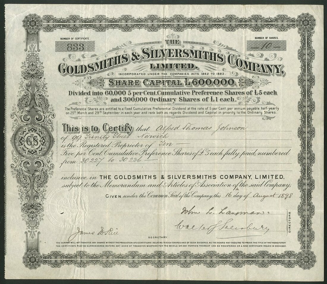 Great Britain: Goldsmiths & Silversmiths Co. Ltd., 5% cumulative preference shares of £5, [1898], #833, signed by John Lawrence Langman as director, ornate border, black. Formed in 1880 by John Langman and William Gibson in Regent Street, London. Converted to a joint stock company in 1893 after acquiring the Goldsmith's Alliance Ltd. Amalgamated with the Crown jewellers, Garrards in 1952. VF and rare.