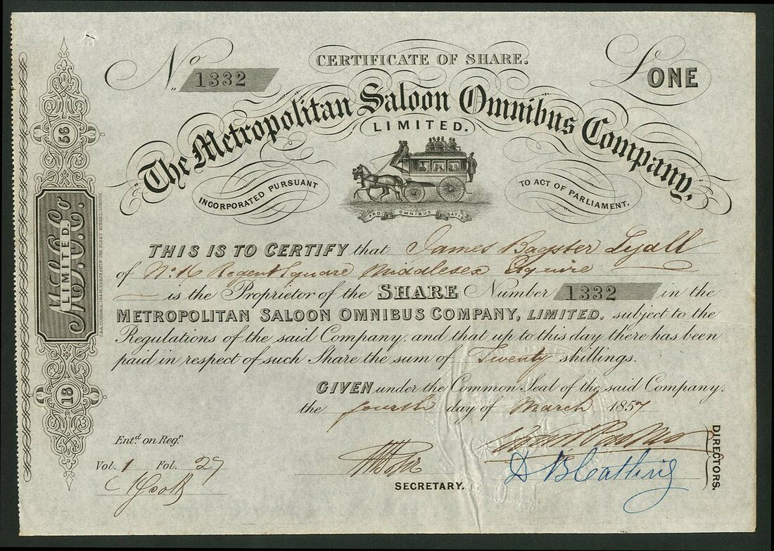 Great Britain: Metropolitan Saloon Omnibus Co. Ltd., one share, 20 shillings paid, 185[7], #1332, horse drawn omnibus in centre with passengers inside and out, black. EF.
