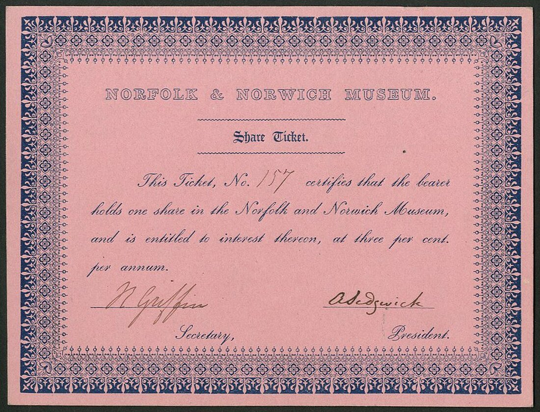 Great Britain: Norfolk & Norwich Museum, share ticket, circa 1838, #157, small piece with ornate border, blue on pink paper. Founded in 1825 by the Norfolk and Norwich Literary Institution to supplement their collection of books. Originally the collections were kept at a local printing office but by 1833 they were moved to a purpose built building in Exchange Street, Norwich. It was only available to members of the Institution and not the general public. In 1883 the City of Norwich acquired the old Castle and prison and converted it for use as a public museum. The private collections of the Norfolk and Norwich museum were given to the City in 1883 and the new Museum opened in 1894. EF.