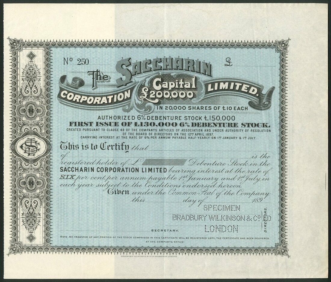 Great Britain: Saccharin Corporation Limited, a specimen debenture stock certificate from the Bradbury, Wilkinson & Co. archives, 189-, black, blue underprint. This artificial sweetener (sugar) was first noticed in America in 1879. Commercially produced by 1886. This company was formed to work the paptent in Great Britain and the Colonies. GVF and rare.