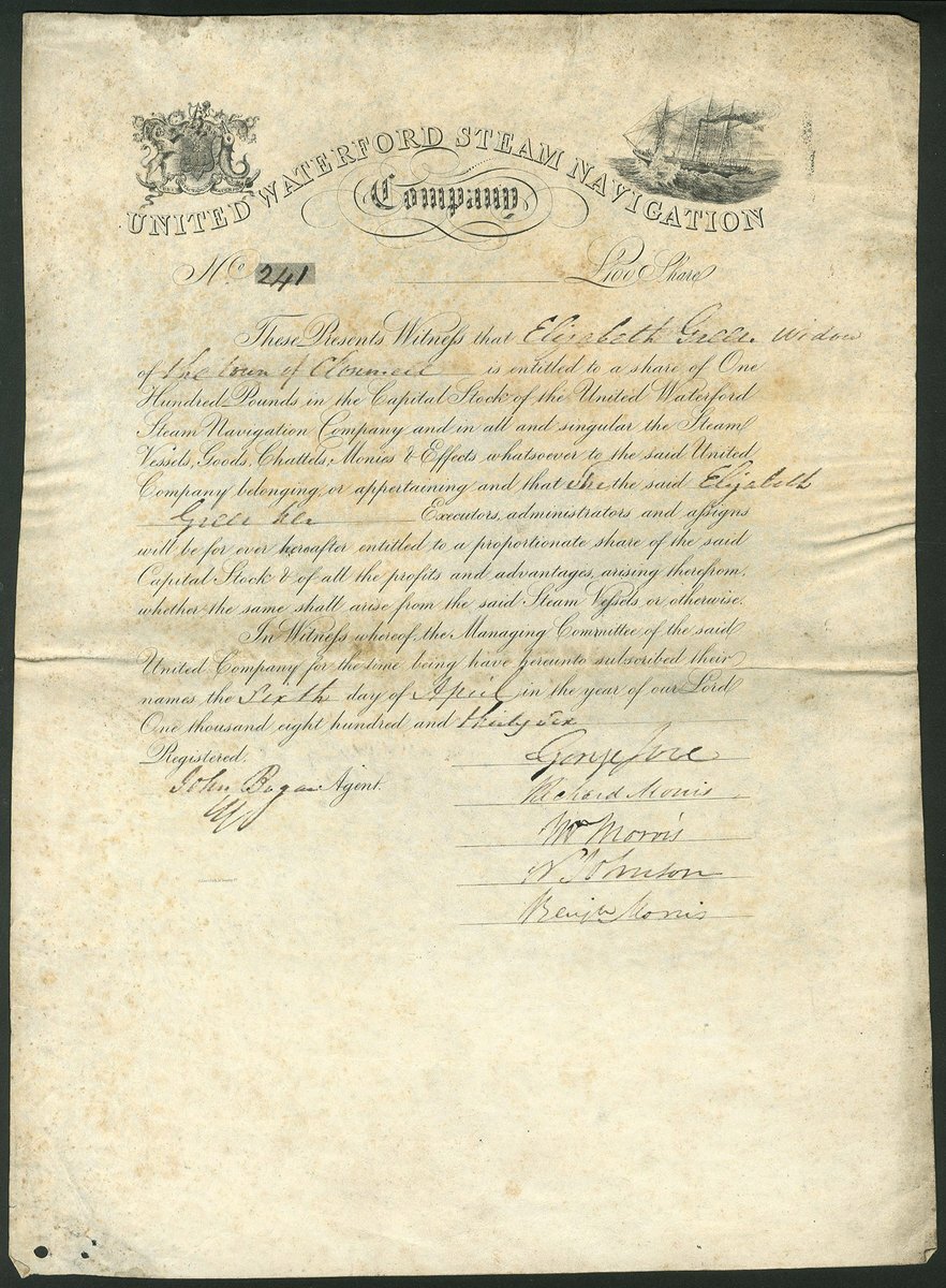 Ireland: United Waterford Steam Navigation Co., one share of £100, 18[36], #241, Waterford coat of arms top left and steamship to right, black on vellum. We can find little about this company. The name implies that it was the union of two or more companies before 1836. It operated shipping services between Waterford and Bristol and Liverpool in competition with the Waterford Commercial Steam Navigation Company and the Waterford and Duncannon Steam Navigation Company Discolouration to vellum, otherwise VF and rare.