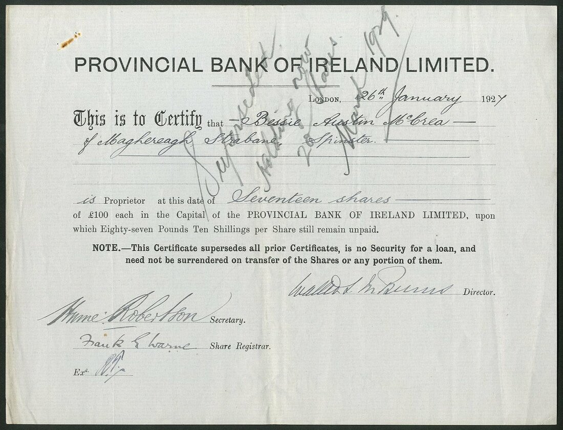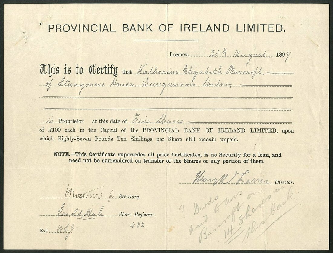 Ireland: Provincial Bank of Ireland Ltd., pair of certificates for £100 shares, 189[7] and 192[7], black printing on buff and grey respectively. Both have pencil annotation on face, VF. (2)