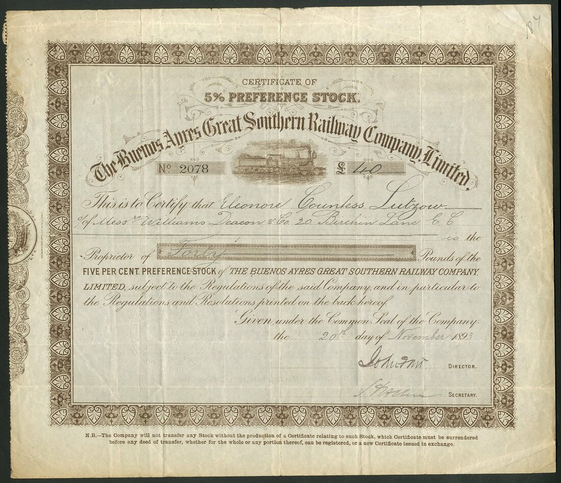 Argentina: Buenos Ayres Great Southern Railway Company Ltd., 5% preference stock, 189[3], #2078, small vignette of steam engine and tender, ornate border, brown, printed by Waterlow & Sons.VF and rare.
