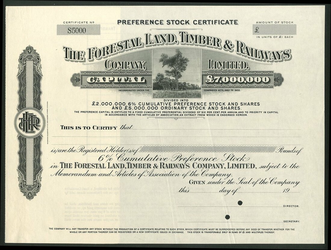 Argentina: Forestal Land, Timber & Railways Co. Ltd., a specimen certificate for 6% Cumulative Preference stock, from the Bradbury, Wilkinson archives, circa 1910, vignette of forest, black, with counterfoil. Incorporated in 1906 with Emile d'Erlanger as Chairman to acquire 2,700,000 acres of land in the Province of Santa Fe and the territory of El Chaco. It was the largest producer of quebracho logs and extract. It also owned and operated over 250 miles of narrow gauge railways in the region. EF.