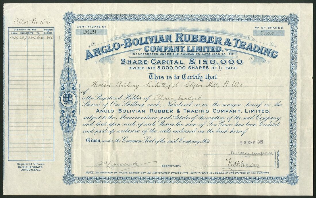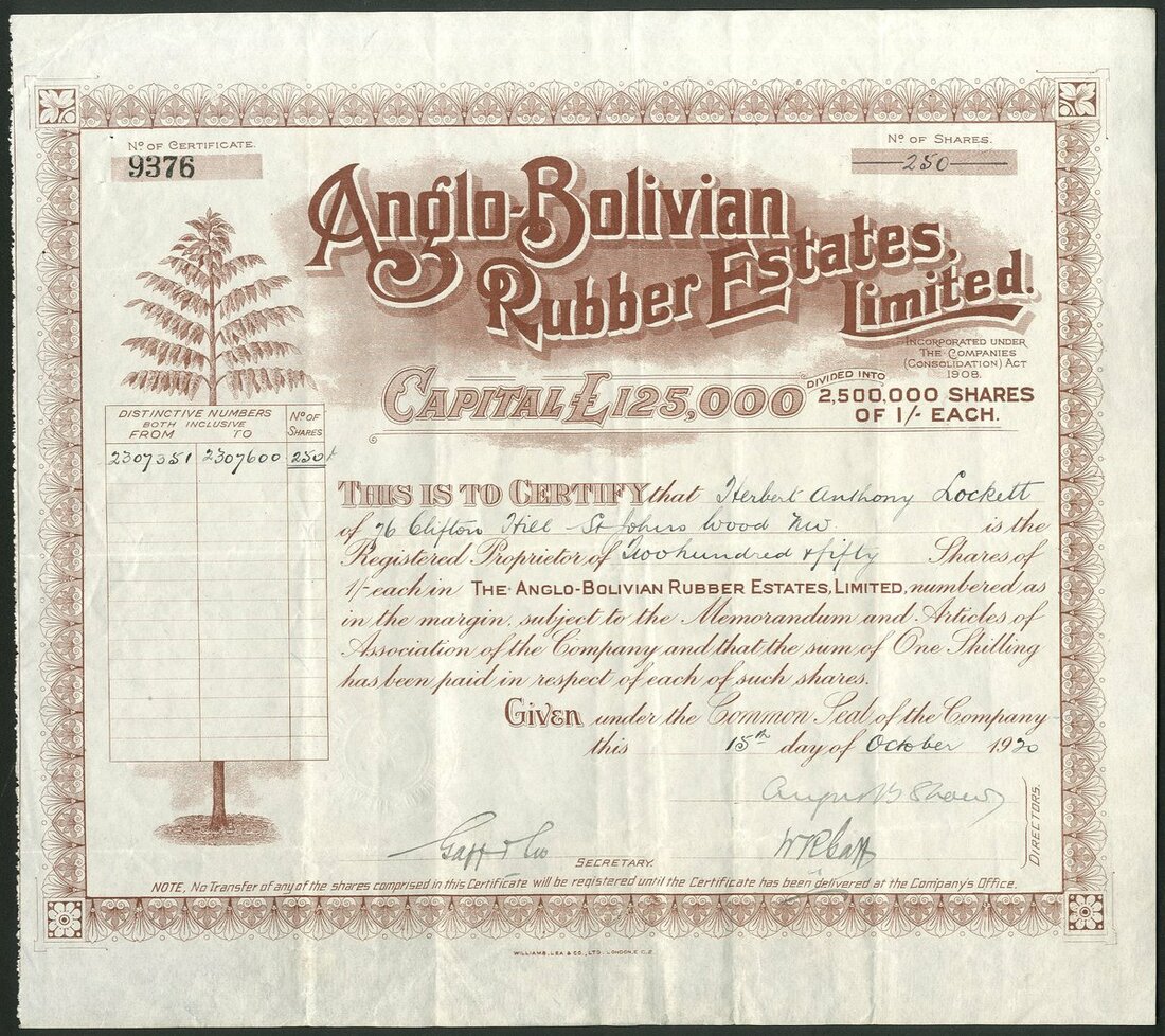Bolivia: Anglo-Bolivian Rubber Estates Ltd., 1/- shares, 19[20], #9376, decorative border, brown, together with Anglo-Bolivian Rubber & Trading Co. Ltd., 1/- shares, [1921], #2629, decorative border, blue. Both VF. (2)
