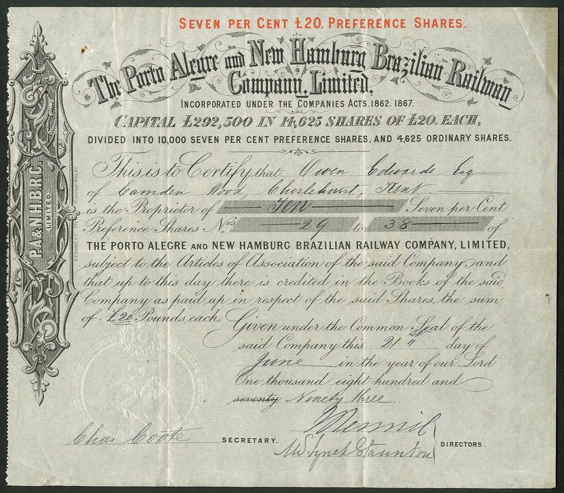 Brazil: Porto Alegre & New Hamburg Brazilian Railway Co. Ltd., £20 7% preference shares, 187[93], #29-38, black. Constructed a line between Porto Allegre and San Leopoldo, completed in 1874. Novo Hamburgo was a sub district of San Leopoldo in the State of Rio Grande de Sul. Pin holes top left, small edge nick, VF.
