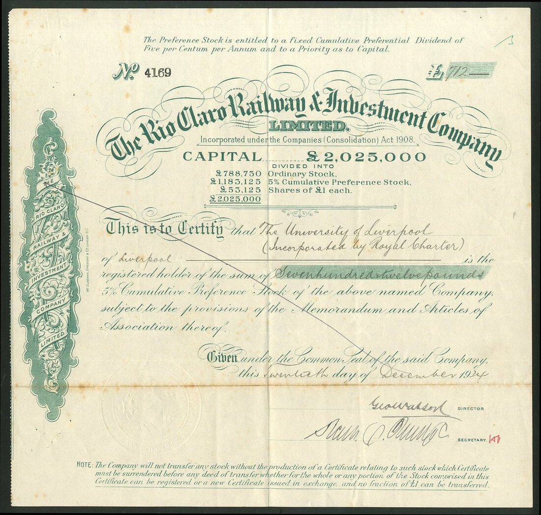 Brazil: Rio Claro Railway & Investment Co. Ltd., 5% Cumulative Preference stock certificate, 19[34], #4169, green single line cancel across face. Formed in 1912 to acquire a line owned by local companies in the State of Sao Paolo. VF.