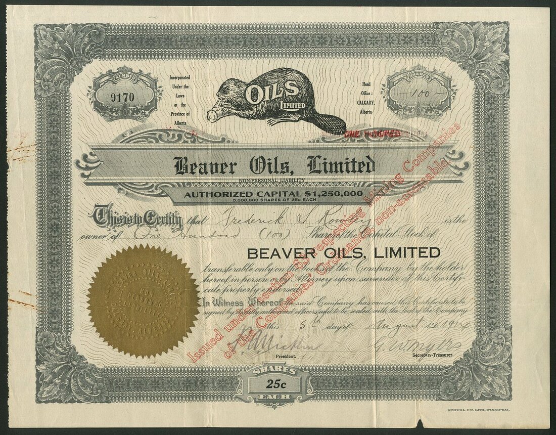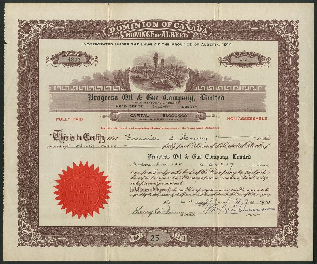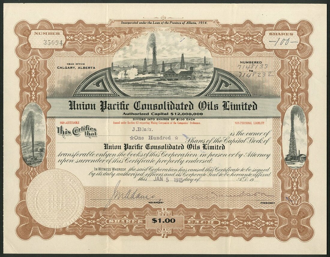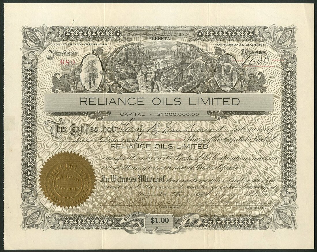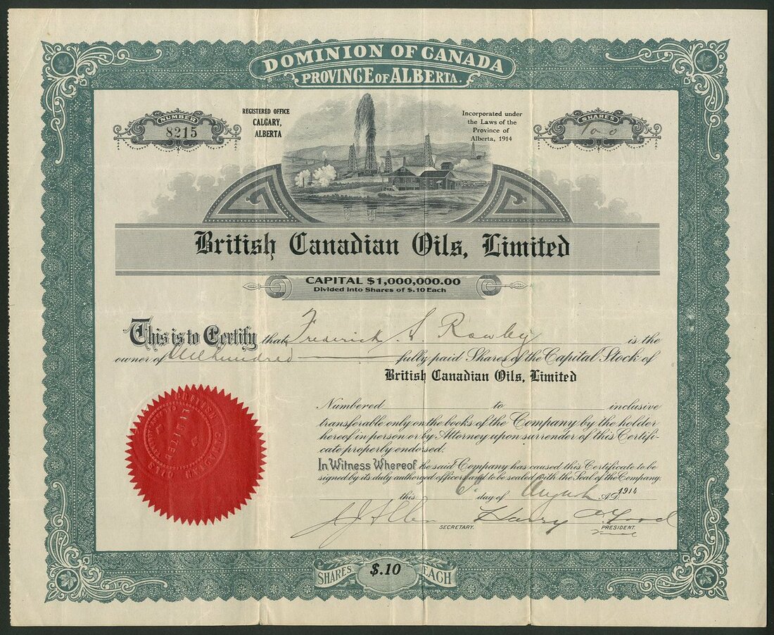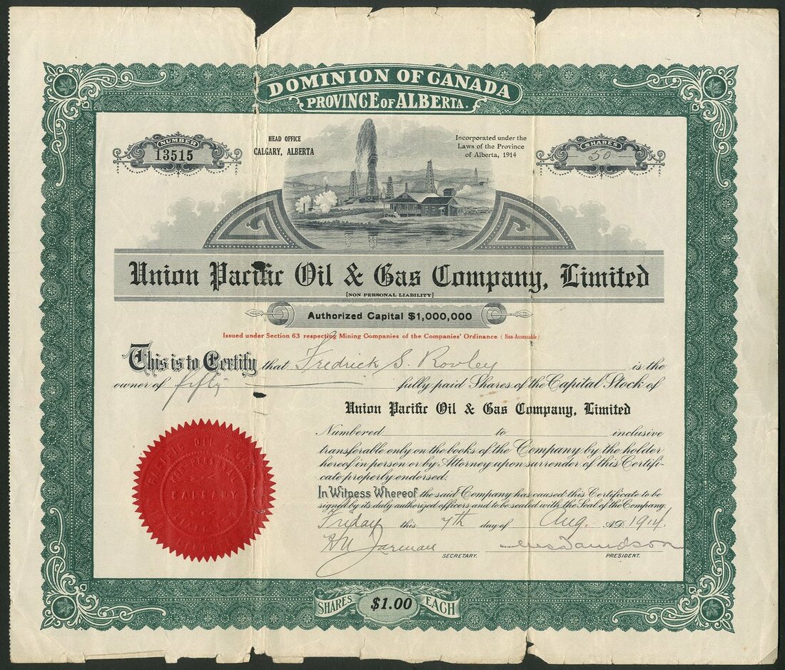 Canada: A group of Alberta Oil companies, comprising; Christy Oil Co. Ltd., 10c shares, 19[14]; Beaver Oils Ltd., 25c shares, [1914]; Black Diamond No.2 Ltd., [1914]; Brad Oil Co. Ltd., 191[1]; British Canadian Oils Ltd., [1914]; Monarch Oil Co. Ltd., 191[5]; Progress Oil & Gas Co. Ltd., [1914]; Reliance Oils Ltd., 19[14]; Stokes-Stephens Oil Co. Ltd., [1914]; Union Pacific Consolidated Oils Ltd., 19[15], and Union Pacific Oil & Gas Co. Ltd., [1914], most with vignettes. The first AEF, others with heavier folds and slight edge damage, VF or close, the last only F. (11)