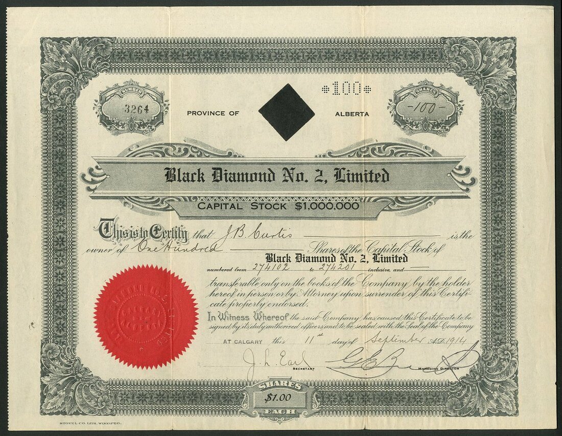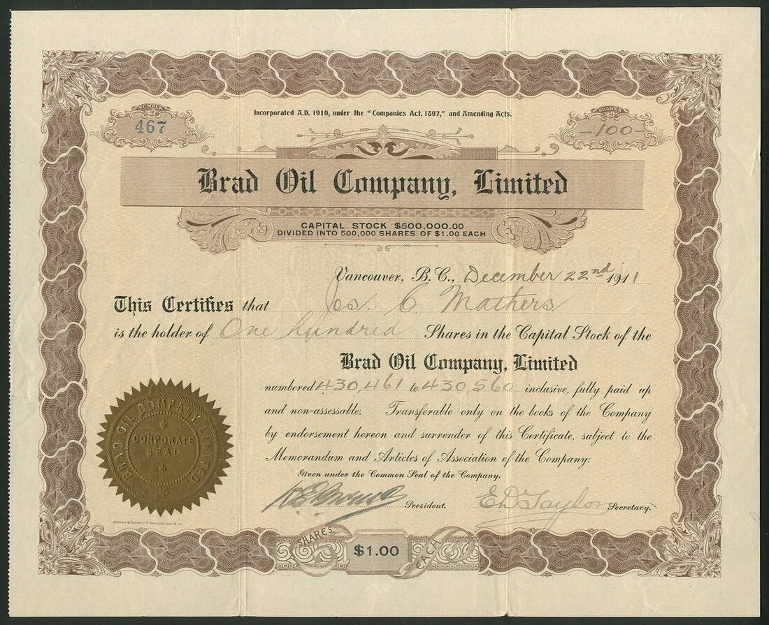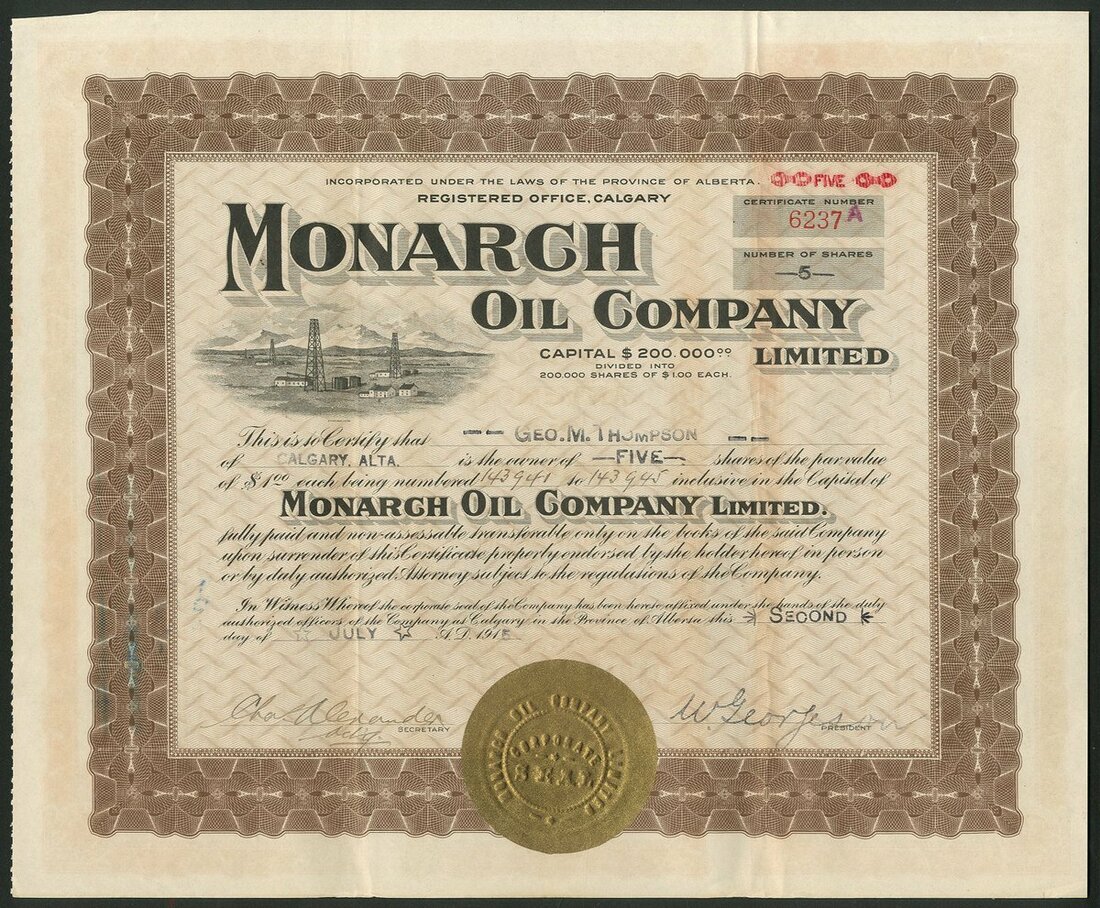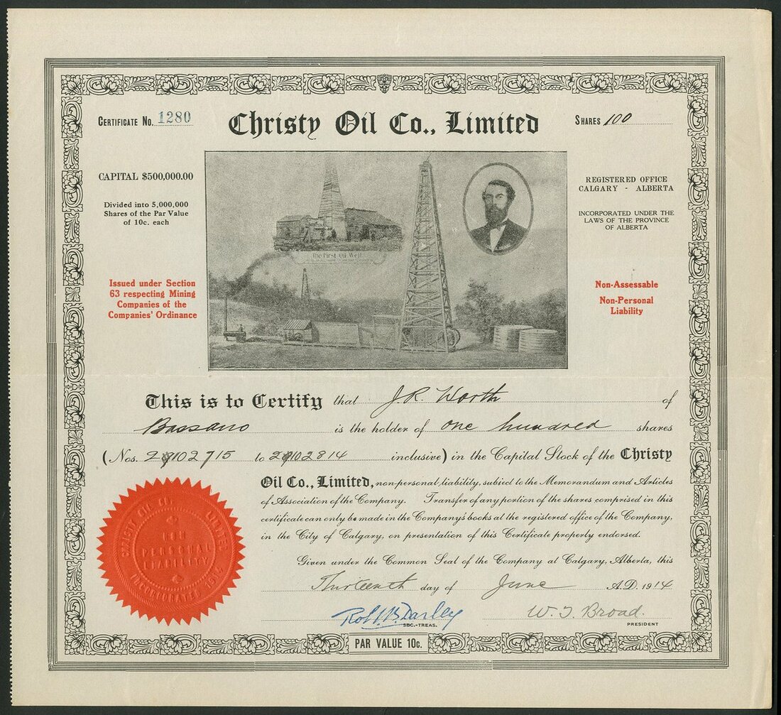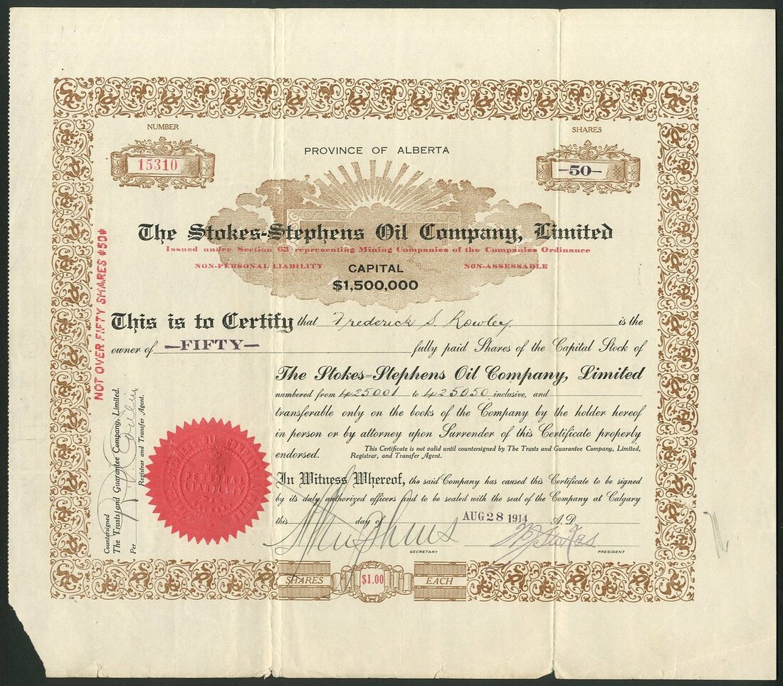Canada: A group of Alberta Oil companies, comprising; Christy Oil Co. Ltd., 10c shares, 19[14]; Beaver Oils Ltd., 25c shares, [1914]; Black Diamond No.2 Ltd., [1914]; Brad Oil Co. Ltd., 191[1]; British Canadian Oils Ltd., [1914]; Monarch Oil Co. Ltd., 191[5]; Progress Oil & Gas Co. Ltd., [1914]; Reliance Oils Ltd., 19[14]; Stokes-Stephens Oil Co. Ltd., [1914]; Union Pacific Consolidated Oils Ltd., 19[15], and Union Pacific Oil & Gas Co. Ltd., [1914], most with vignettes. The first AEF, others with heavier folds and slight edge damage, VF or close, the last only F. (11)