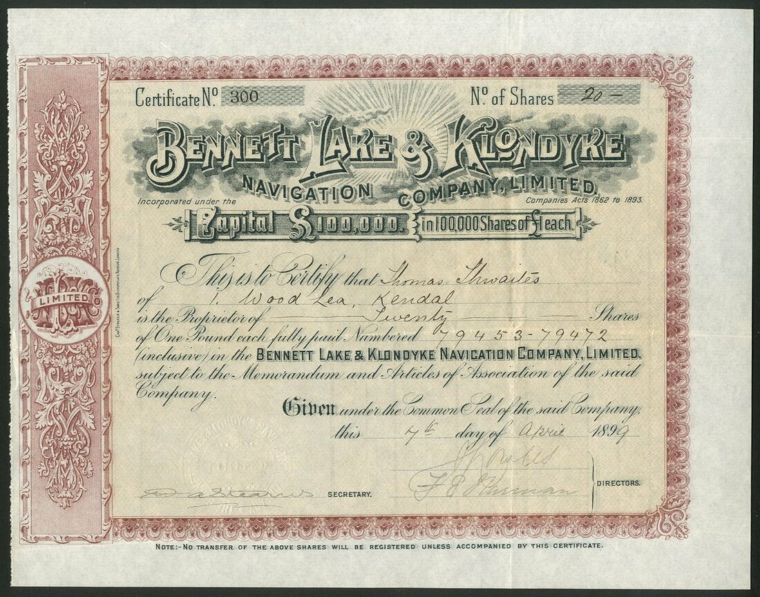 Canada: Bennett Lake & Klondyke Navigation Co. Ltd., £1 shares, 189[9], #300, decorative title and ornate border, black and rust with yellow underprint. One of the most important companies involved in steamship transport services to the Klondyke gold rush, running 3 steamers from Dawson to White Horse. First time in our auctions. AEF.