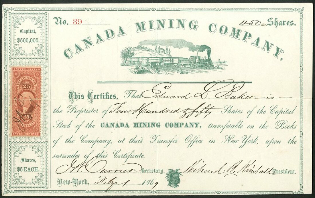 (x) Canada Mining Company, New York, $5 shares, 186[9], steam train, green, adhesive revenue at left. Owned properties at "South Echo" presumably around Echo Lake and Echo Bay near Lake Huron in Ontario. GVF.