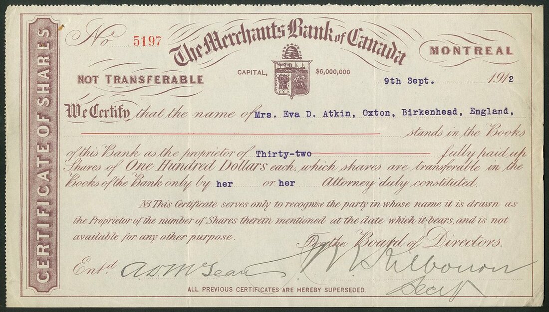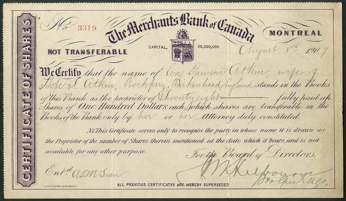 Canada: Merchants Bank of Canada, Montreal, pair of certificates for $100 shares, 190[7], #3319 and 191[2], #5197, issued to the same shareholder, both of the same design, the first dark purple with a printer's imprint, the second mauve but without printer's imprint. Formed in 1861 in Quebec. Acquired the Commercial Bank of Canada in 1867 and by 11919 had built a network of 329 branches. Taken over by the Bank of Montreal in 1922. Both VF and rare (2).