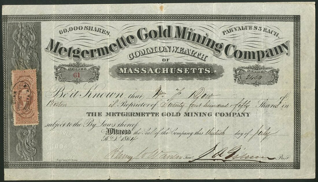 Canada: Metgermette Gold Mining Co. (MA), $5 shares, 186[4], #61, ornate border, black. Formed in Massachusetts to acquire property on the Metgermette River, a tributary of the Riviere du Loup, in Canada East. Slight tearing on creases and discolouration, about VF.