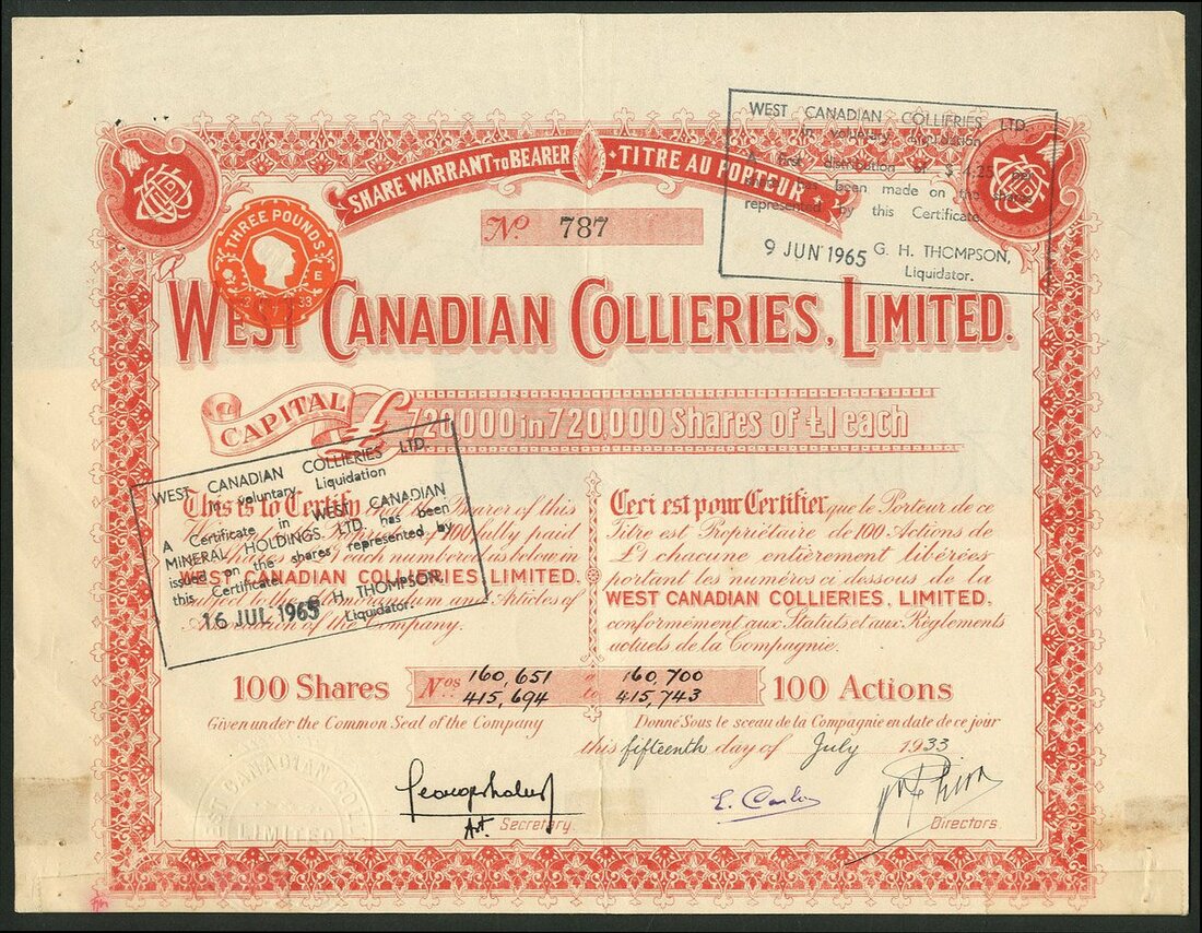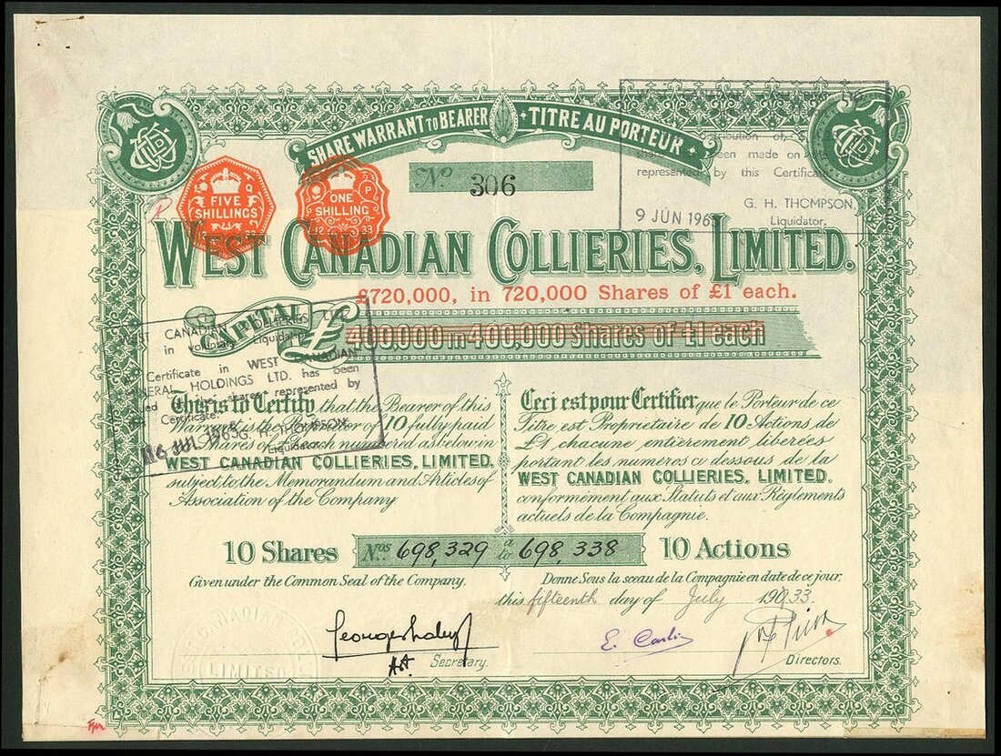 Canada: West Canadian Collieries Limited, a pair of certificates, 10 shares of £1, 190[33], #306, increased capital overprinted in red, green, with coupons, and 100 shares of £1, 19[33], #787, red, with coupons, all reattached with tape. VF and scarce (2).