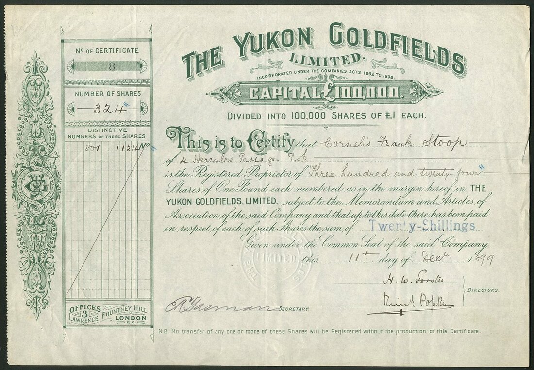 Canada: Yukon Goldfields Ltd., £1 shares, 1[899], #8, green. Formed to investigate mining possibilities in the Klondyke, British Columbia. Managed by the London and British Columbia Goldfields Ltd. GVF.