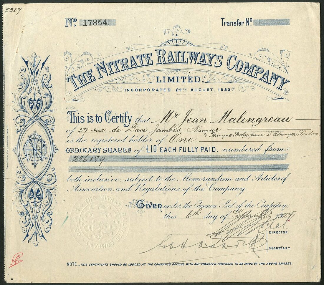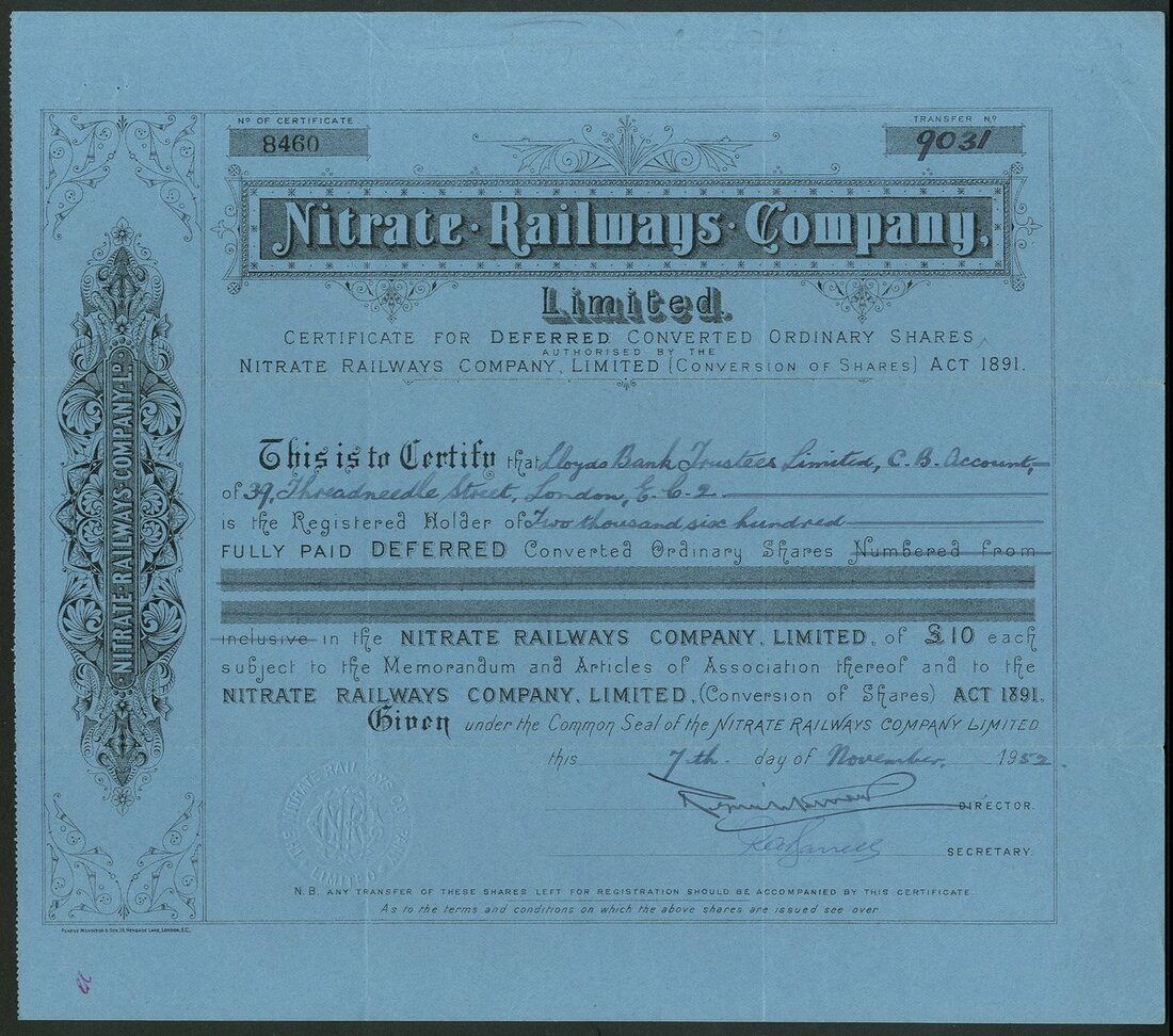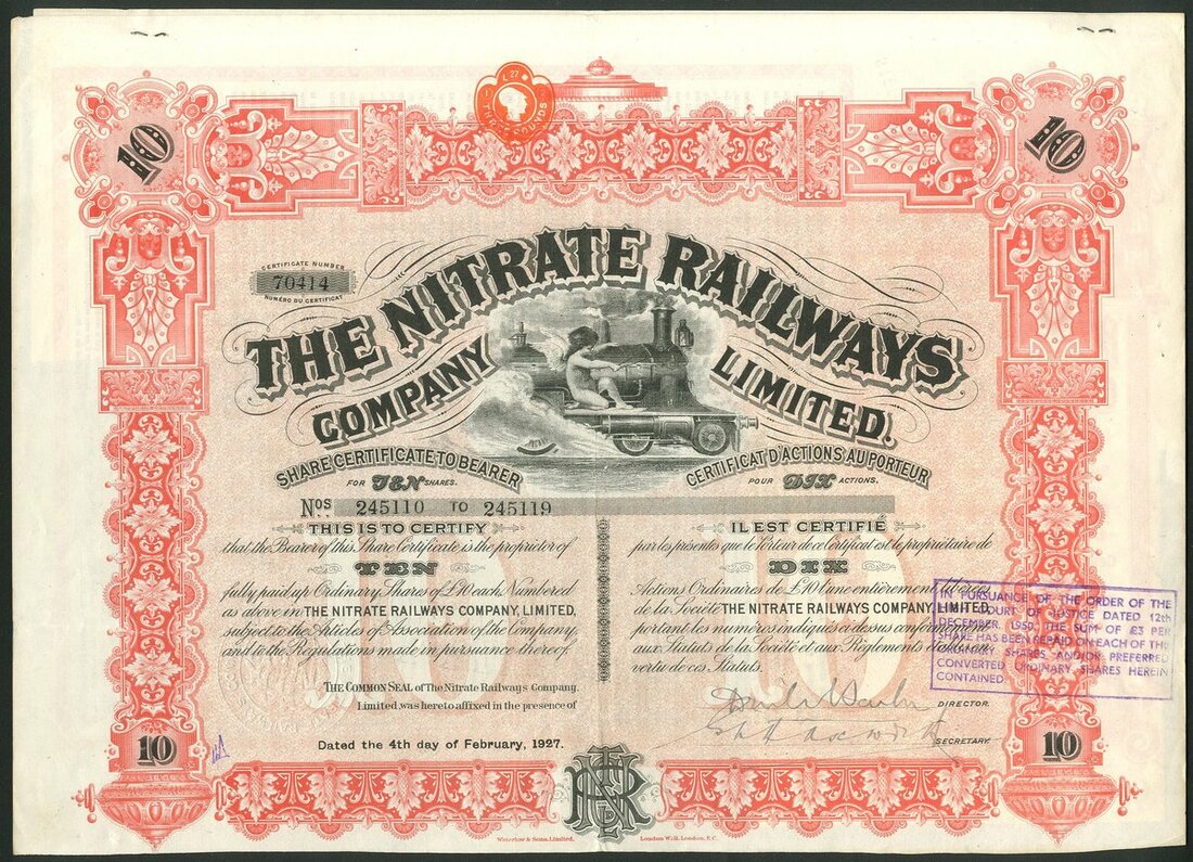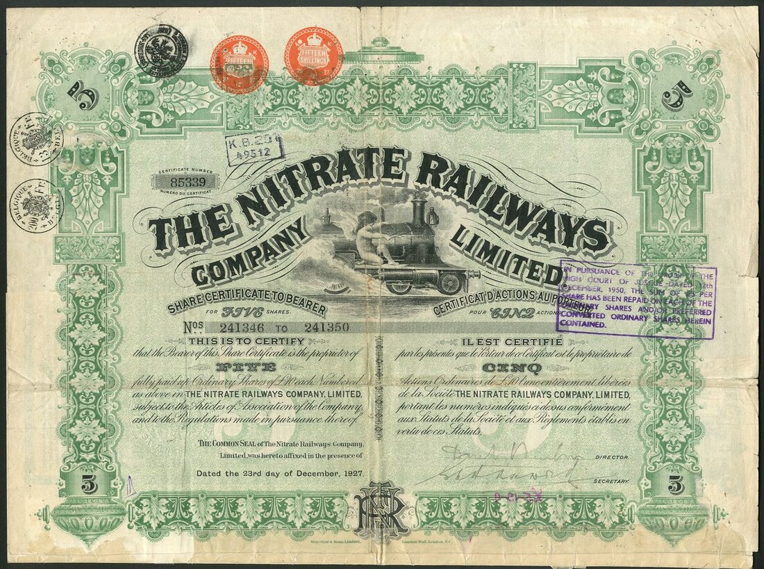 Chile: Nitrate Railways Co. Ltd., a small group of certificates comprising £10 ordinary shares, 19[27], #17854, blue; deferred converted ordinary shares, 19[52], #8460, black on blue paper; bearer certificates for 5 shares, 1927, #85339 and 10 shares, 1927, #70414, the last 2 printed by Waterlow, with vignettes of cherub riding on steam train. This British company built a line from the nitrate plains to the port of Tocopilla. Acquired by the State in 1940. Fine to good very fine, the first 2 scarce (4).