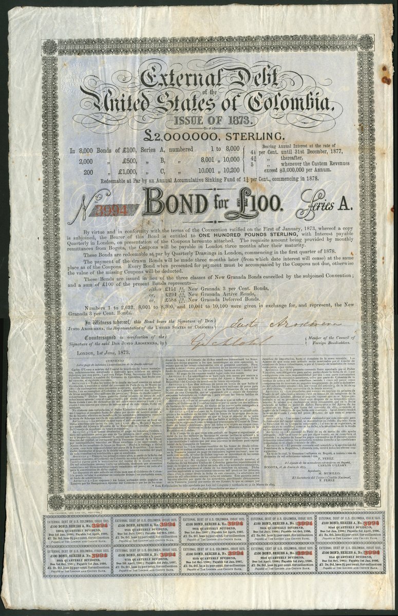 Colombia: 1873 4½-5% External Debt, bond for £100, #3994, large format piece, black, blue underprint, with coupons. Issued in exchange for previous issues of New Granada bonds. Somewhat creased, split along fold at top right, fine and very rare. All repaid.