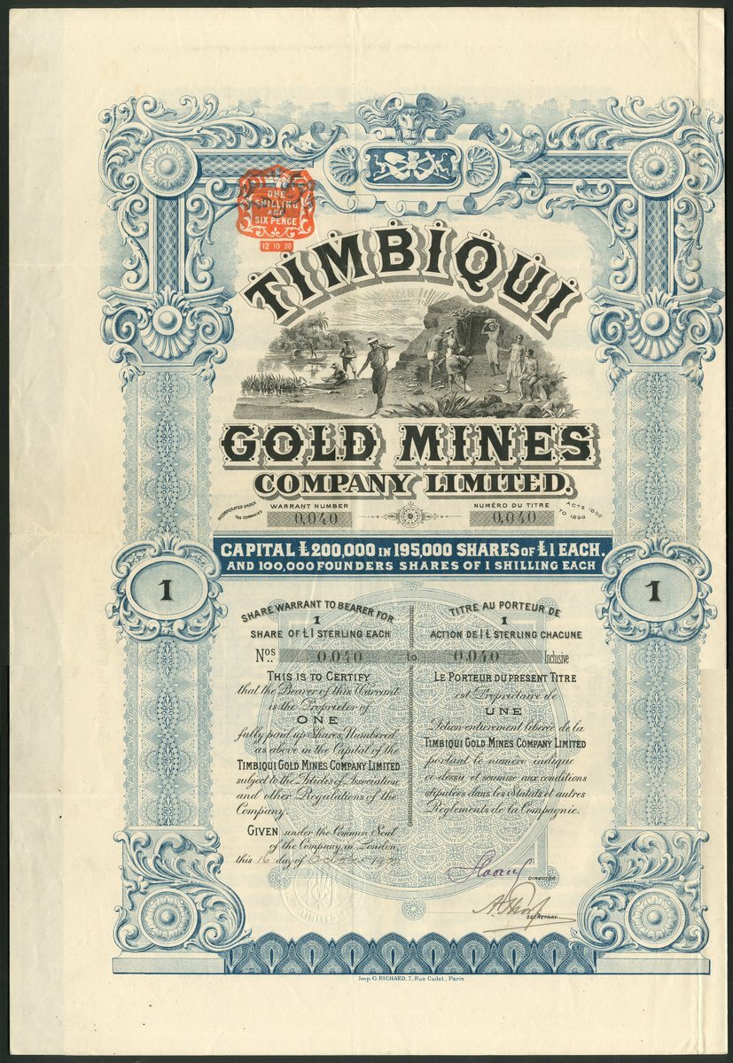 Colombia: Timbiqui Gold Mines Co. Ltd., one bearer share of £1, 1[900], #0040, lovely vignette of gold panning on riverbank at top, decorative architectural border, blue and black, with coupons. The company began under British control and passed to the French before closing at the end of WW1. GVF.