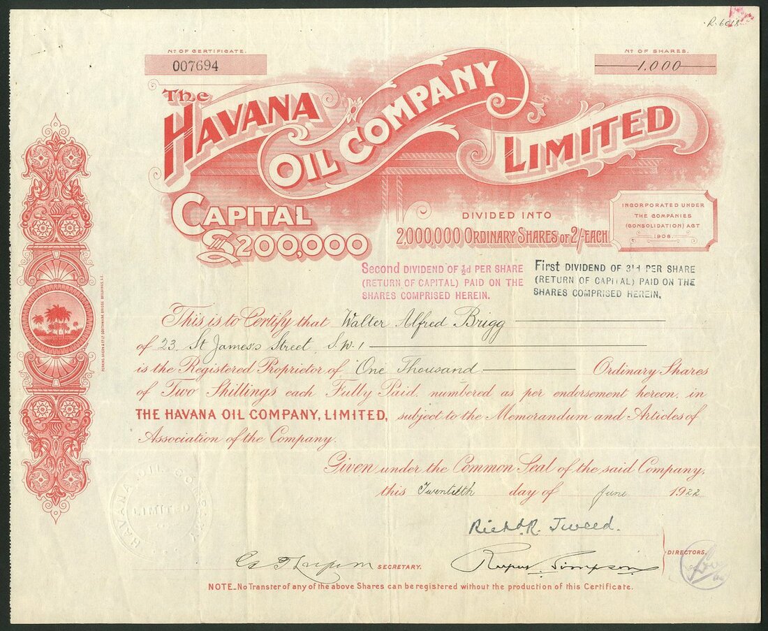 Cuba: Havana Oil Company Ltd., 2/- shares, 19[22], #7694, red. Workings on the Mariel properties near Havana, formed to acquire sole right to drill this area from the Havana Exploration Company. VF.