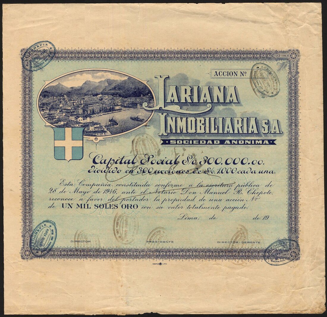 Peru: Lariana Immobiliaria S.A., a specimen share certificate for one share of 1000 soles (of only 300 issued), Lima 19-, circa 1946), city view at top left, blue, several handstamps. VF and rare.