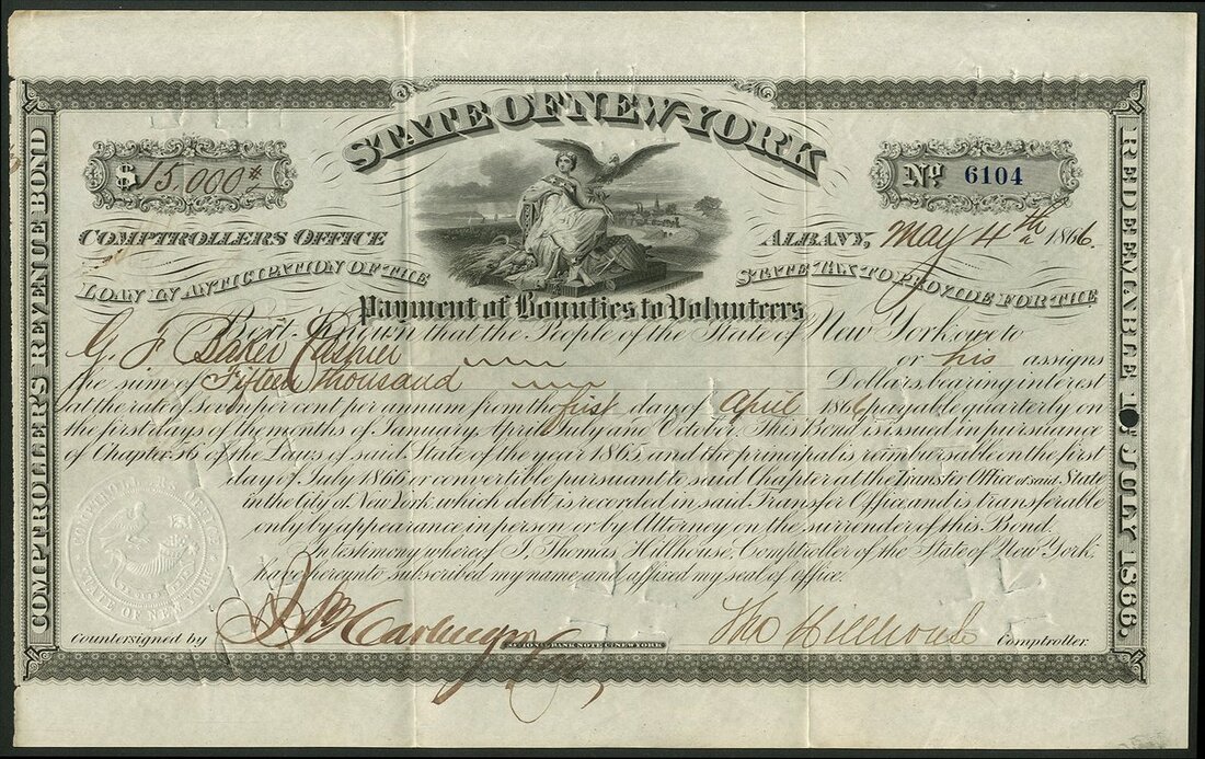 (x) U.S.A.: State of New York, Loan in anticipation of the State Tax to provide for the payment of Bounties to Volunteers, bond dated 186[6], #6104, decorative black printing, cancelled, signed by George F Baker 'Cashier', he was also co-founder of the First National Bank of the City of New York and made a large fortune both in banking and railroads. VF.