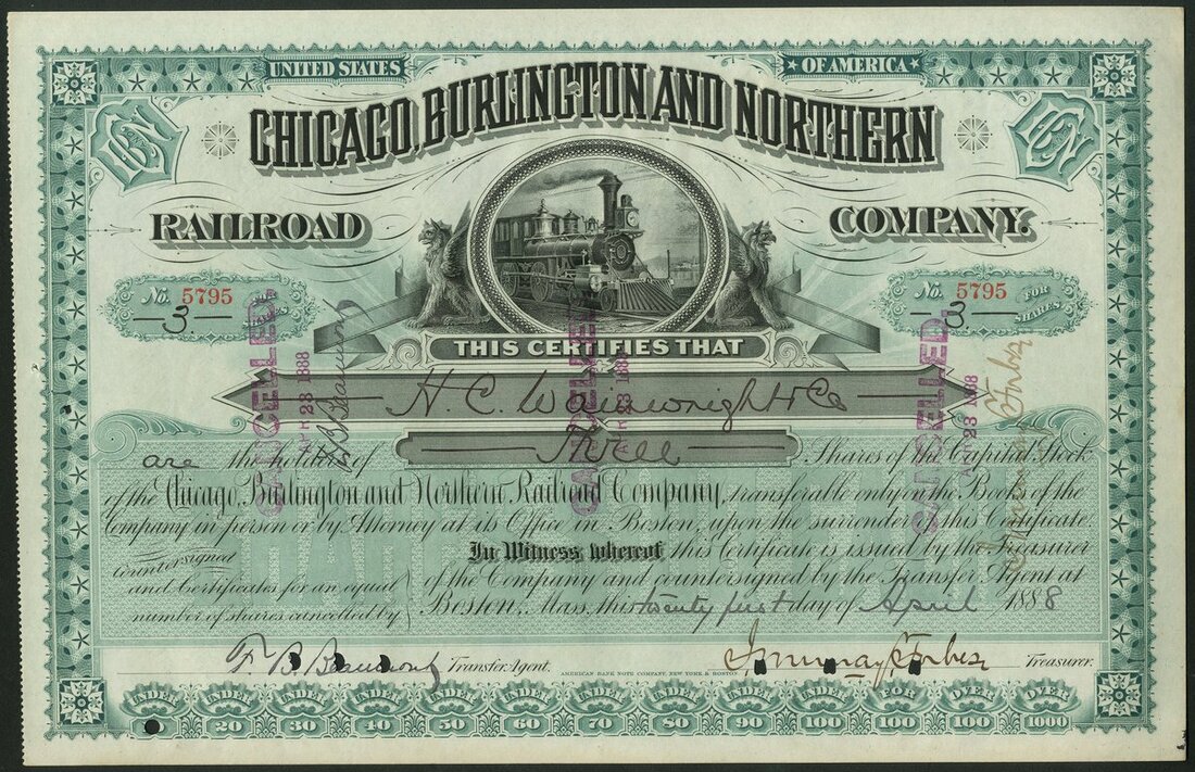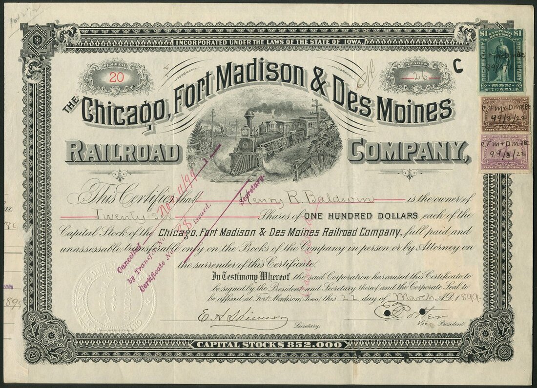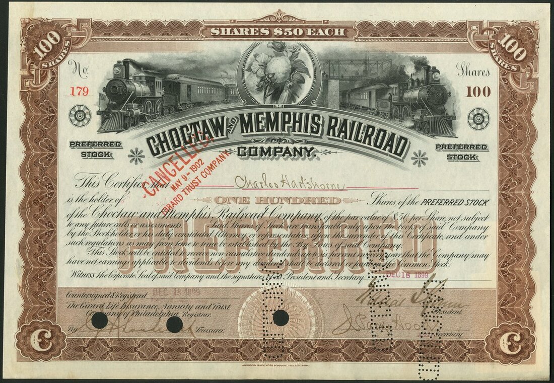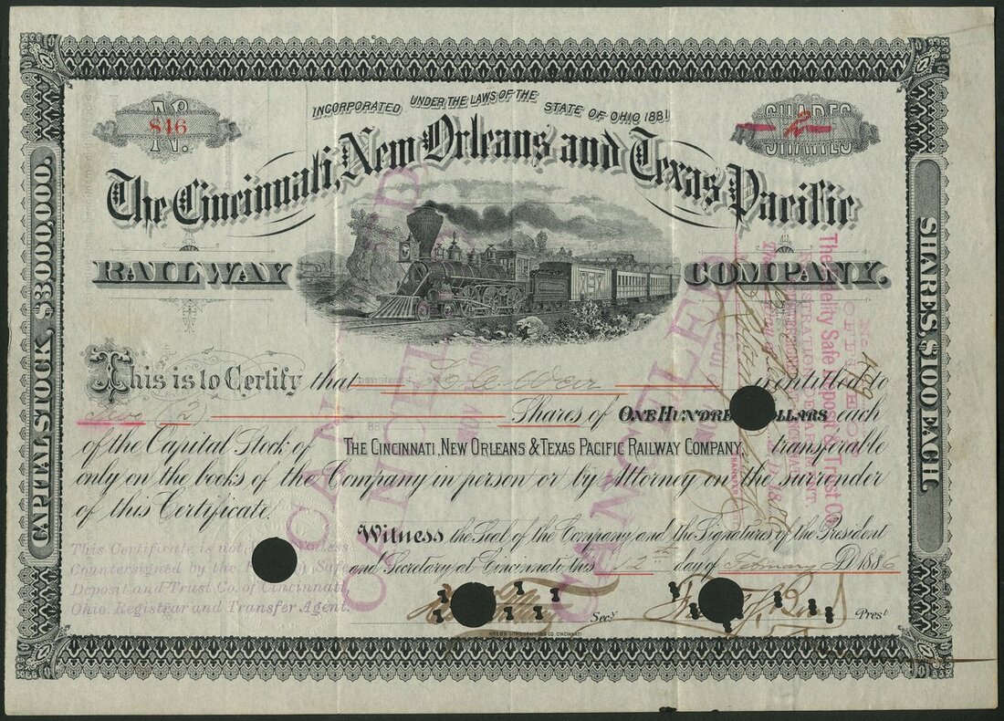 U.S.A.: A collection of 10 different railroad certificates, comprising Chicago, Burlington and Northern Railroad Co., 188[8]; Chicago, Fort Madison & des Moines Railroad Co., 1[899]; Choctaw and Memphis Railroad Co., [1899]; Cincinnati, Indianapolis, St.Louis and Chicago, 3 different types, 18[80], 18- unissued and 18[89]; Cincinnati, New Orleans and Texas Pacific Railway Co., 188[6]; Cincinnati, Portsmouth & Virginia Railroad Co., 189[3]; Cincinnati, Richmond and Fort Wayne Railroad Co., 18[69], and, Cincinnati, Wilmington & Zanesville Rail Road Co., 185[7]. Most with vignettes, most cancelled. Generally VF and better (10).