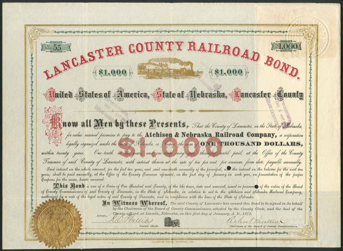 U.S.A.: Atchison & Nebraska Railroad Co., bond issued by Lancaster County, Nebraska, 1872, $1000, #55, in aid of the railway, steam train in centre, red, green, gold and black, gold seal, cancelled, no coupons remain, auditors label on reverse, only 120 issued. VF and rare.