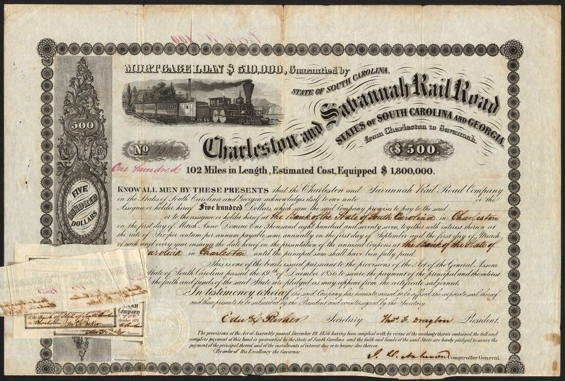 U.S.A.: Charleston and Savannah Rail Road, mortgage bond for $500, 1856, #100, signed by Thomas F Drayton as President, vignette of steam train, black, with coupons. Thomas Fenwick Drayton, 1809 -1891, planter, politician and military officer, served as a Brigadier General in the Confederacy. Folds, slight ink burning, AVF and scarce.